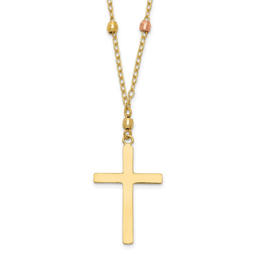 14K Tri-Color Beaded Chain Necklace with Polished Cross Pendant, 18