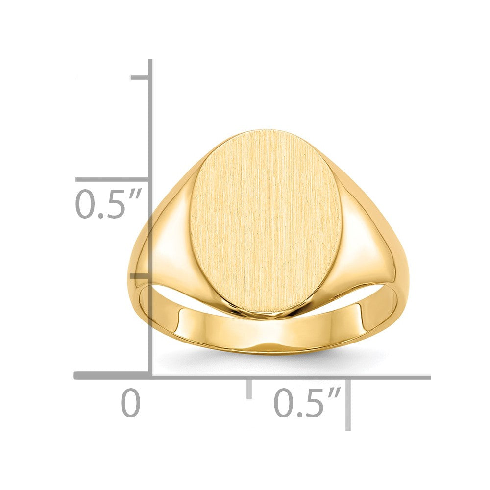 Specifications: Material: Primary - Purity:10K|Finish:Polished & Brushed|Band Width:3 to 14 mm (tapered)|Size (Minimum):4.75|Size (Maximum):8.75|Material: Primary:Gold|Sizeable:Yes|Width of Item:3 to 14 mm (tapered)|Engravable:Yes|Product Type:Jewelry|Jewelry Type:Rings|Sold By Unit:Each|Gender:Unisex|Texture:Satin|Profile Type:Closed Back|Material: Primary - Color:Yellow|Ring Type:Signet Ring|Ring Top Length:14 mm|Ring Top Width:10 mm