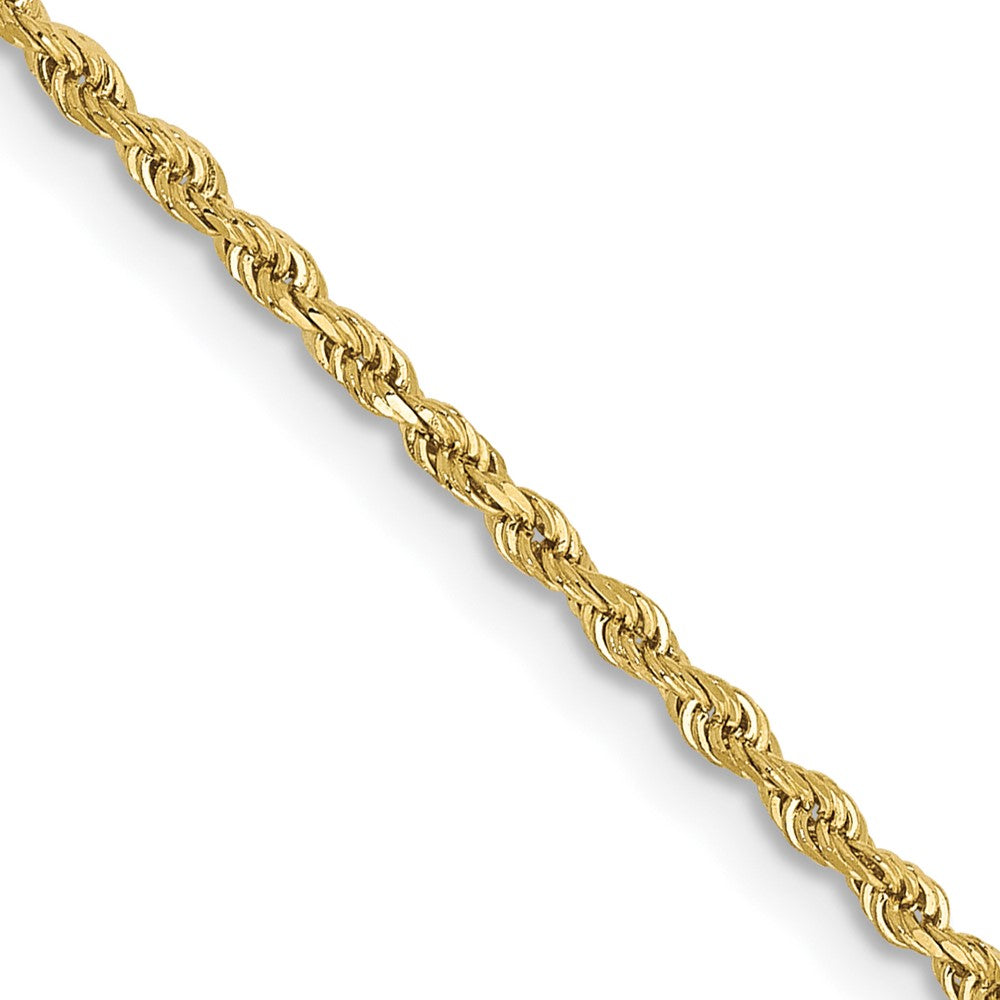 Specifications: Material: Primary - Purity:10K|Finish:Polished|Length of Item:18 in|Chain Length:18 in|Chain Type:Rope|Chain Width:1.5 mm|Clasp /Connector:Lobster|Feature:Solid|Manufacturing Process:Hand Made|Material: Primary:Gold|Width of Item:1.5 mm|Product Type:Jewelry|Jewelry Type:Chains|Sold By Unit:Each|Necklace Type:Chain Styles|Gender:Unisex|Texture:Diamond-cut|Material: Primary - Color:Yellow