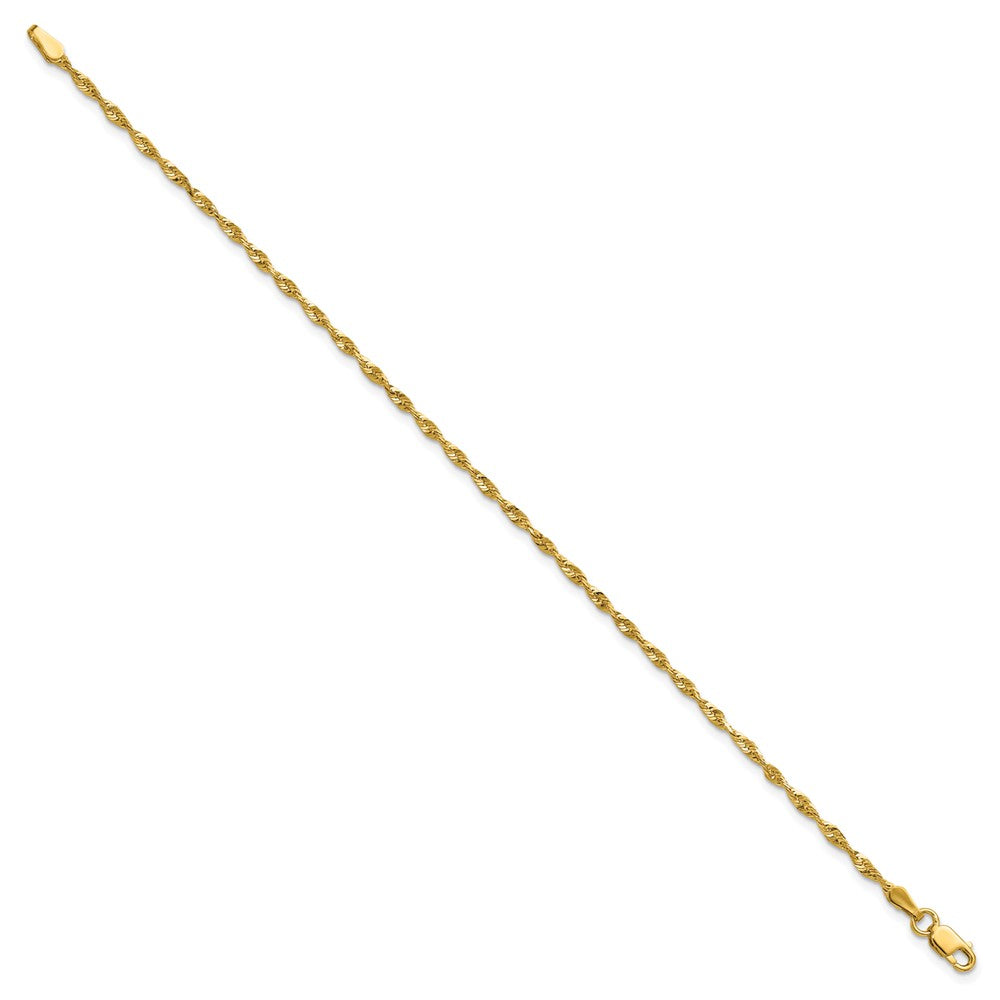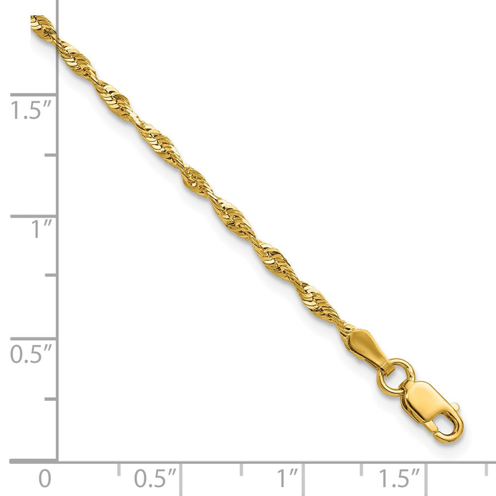 Specifications: Material: Primary - Purity:10K|Finish:Polished|Length of Item:7 in|Chain Length:7 in|Chain Type:Rope|Chain Width:2 mm|Clasp /Connector:Lobster|Feature:Solid|Material: Primary:Gold|Width of Item:2 mm|Product Type:Jewelry|Jewelry Type:Chains|Sold By Unit:Per Inch|Bracelet Type:Chain Styles|Gender:Unisex|Texture:Diamond-cut|Material: Primary - Color:Yellow|Feature 2:Lightweight