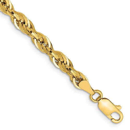 Specifications: Material: Primary - Purity:10K|Finish:Polished|Length of Item:8 in|Chain Length:8 in|Chain Type:Rope|Chain Width:4.25 mm|Clasp /Connector:Lobster|Feature:Semi-Solid|Material: Primary:Gold|Width of Item:4.25 mm|Product Type:Jewelry|Jewelry Type:Chains|Sold By Unit:Each|Bracelet Type:Chain Styles|Gender:Unisex|Material: Primary - Color:Yellow