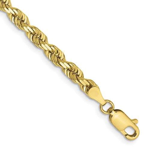 Specifications: Material: Primary - Purity:10K|Finish:Polished|Length of Item:7 in|Chain Length:7 in|Chain Type:Rope|Chain Width:4 mm|Clasp /Connector:Lobster|Feature:Solid|Material: Primary:Gold|Width of Item:4 mm|Product Type:Jewelry|Jewelry Type:Chains|Sold By Unit:Each|Bracelet Type:Chain Styles|Gender:Unisex|Texture:Diamond-cut|Material: Primary - Color:Yellow