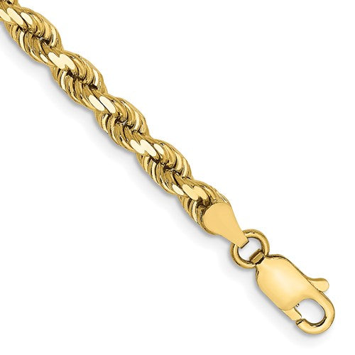Specifications: Material: Primary - Purity:10K|Finish:Polished|Length of Item:7 in|Chain Length:7 in|Chain Type:Rope|Chain Width:4 mm|Clasp /Connector:Lobster|Feature:Solid|Manufacturing Process:Hand Made|Material: Primary:Gold|Width of Item:4 mm|Product Type:Jewelry|Jewelry Type:Chains|Sold By Unit:Per Inch|Bracelet Type:Chain Styles|Gender:Unisex|Texture:Diamond-cut|Material: Primary - Color:Yellow