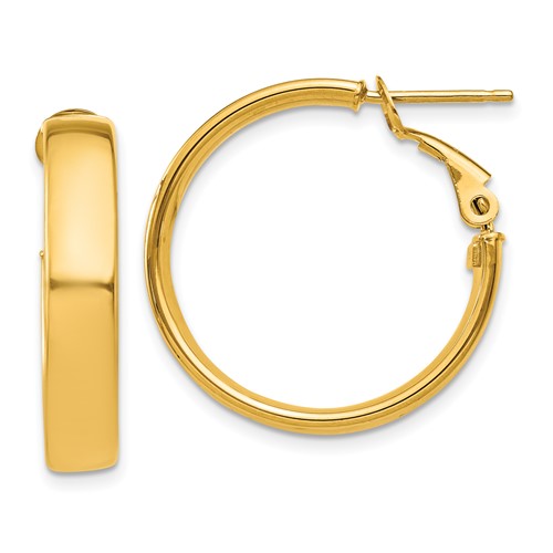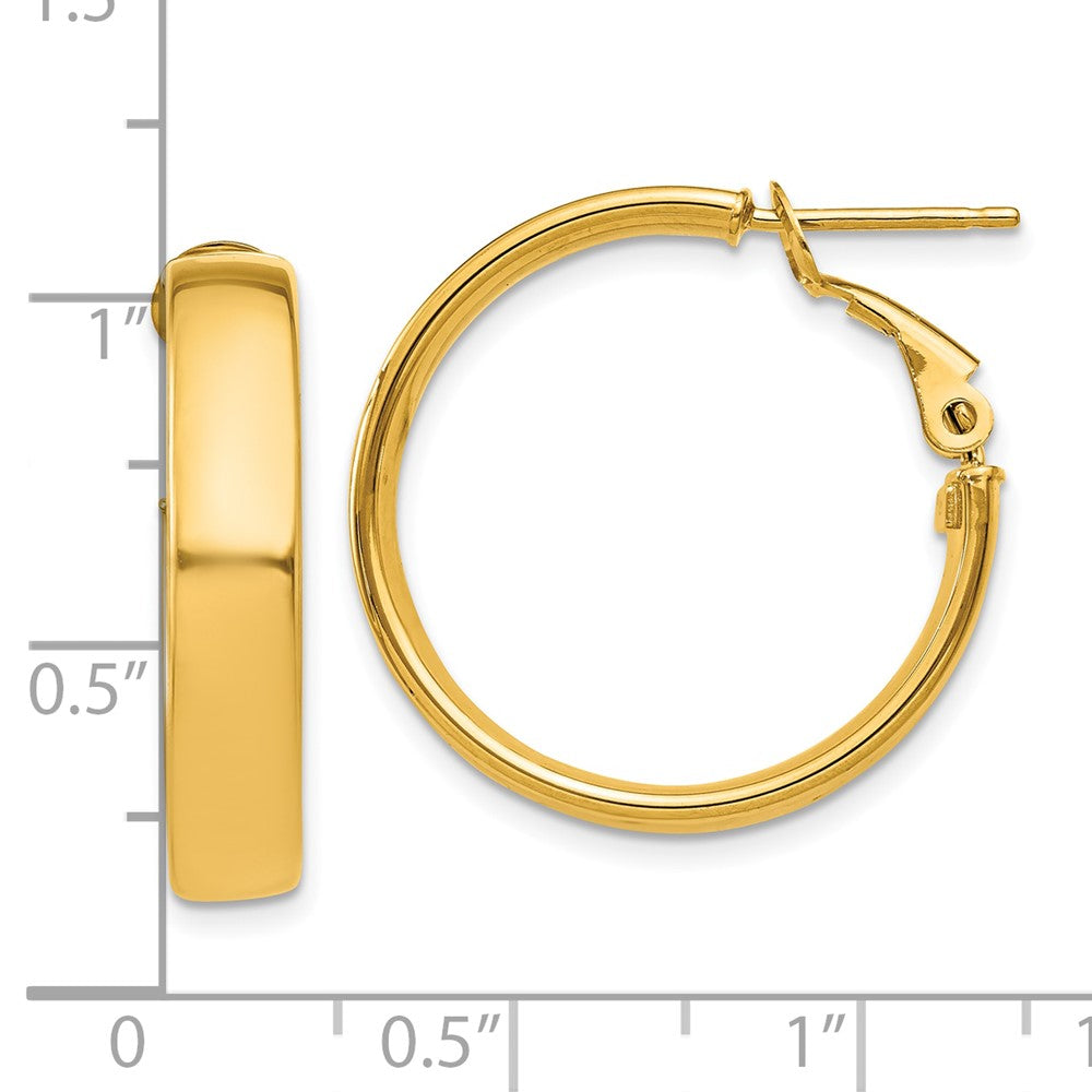 Specifications: Material: Primary - Purity:10K|Finish:Polished|Length of Item:24.25 mm|Feature:Hollow|Material: Primary:Gold|Width of Item:5 mm|Product Type:Jewelry|Jewelry Type:Earrings|Sold By Unit:Pair|Gender:Women's|Material: Primary - Color:Yellow|Earring Closure:Omega Clip Back|Earring Type:Hoop|Diameter Outside:24.25|Diameter Outside U/M:mm