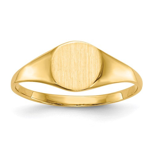 Specifications: Material: Primary - Purity:10K|Finish:Polished & Brushed|Band Width:2 to 7 mm (tapered)|Size (Minimum):4|Size (Maximum):8|Material: Primary:Gold|Sizeable:Yes|Width of Item:2 to 7 mm (tapered)|Engravable:Yes|Product Type:Jewelry|Jewelry Type:Rings|Sold By Unit:Each|Gender:Unisex|Texture:Satin|Profile Type:Closed Back|Material: Primary - Color:Yellow|Ring Type:Signet Ring|Ring Top Length:6.5 mm|Ring Top Width:7.5 mm