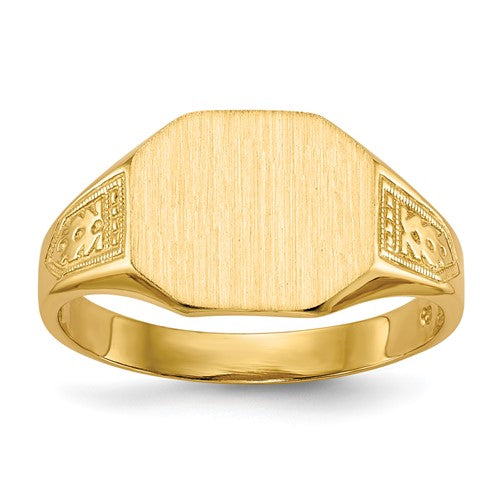 Specifications: Material: Primary - Purity:10K|Finish:Polished & Brushed|Band Width:2 to 9 mm (tapered)|Size (Minimum):4|Size (Maximum):8|Feature:Open Back|Material: Primary:Gold|Sizeable:Yes|Width of Item:2 to 9 mm (tapered)|Engravable:Yes|Product Type:Jewelry|Jewelry Type:Rings|Sold By Unit:Each|Gender:Unisex|Texture:Satin|Profile Type:Open Back|Material: Primary - Color:Yellow|Ring Type:Signet Ring|Ring Top Length:9 mm|Ring Top Width:11 mm