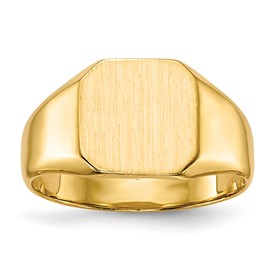 Specifications: Material: Primary - Purity:10K|Finish:Polished & Brushed|Band Width:3 to 9.5 mm (tapered)|Size (Minimum):4|Size (Maximum):8|Material: Primary:Gold|Sizeable:Yes|Width of Item:3 to 9.5 mm (tapered)|Engravable:Yes|Product Type:Jewelry|Jewelry Type:Rings|Sold By Unit:Each|Gender:Men's|Texture:Satin|Profile Type:Closed Back|Material: Primary - Color:Yellow|Ring Type:Signet Ring|Ring Top Length:9.5 mm|Ring Top Width:9.5 mm