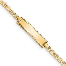 Specifications: Material: Primary - Purity:10K|Stone Quantity_1:1|Length of Item:6 in|Stone Setting_1:|Chain Length:6 in|Chain Type:Anchor|Chain Width:2.5 mm|Charm/Element Length:22.07 mm|Charm/Element Width:4.7 mm|Clasp /Connector:Lobster|Feature:Solid|Material: Primary:Gold|Stone Shape_1:TBD|Stone Size_1:5 x 3 mm|Width of Item:4.7 mm|Engravable:Yes|Product Type:Jewelry|Jewelry Type:Bracelets|Sold By Unit:Each|Bracelet Type:ID Bracelets|Material: Primary - Color:Yellow|Items per Pack:1|Stone Type (Other)_1:Side Stone Mounting(s)