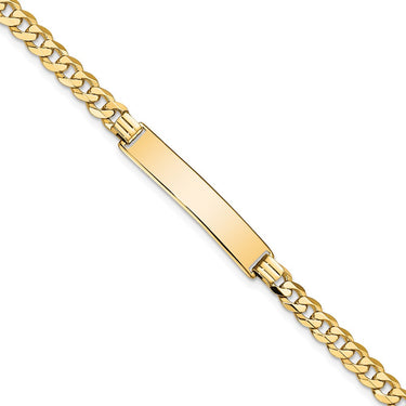Specifications: Material: Primary - Purity:10K|Stone Quantity_1:1|Length of Item:7 in|Stone Setting_1:|Chain Length:7 in|Chain Type:Curb|Chain Width:4.57 mm|Charm/Element Length:31.94 mm|Charm/Element Width:6.4 mm|Clasp /Connector:Lobster|Feature:Solid|Material: Primary:Gold|Stone Shape_1:TBD|Stone Size_1:5.57 x 4.6 mm|Width of Item:6.4 mm|Engravable:Yes|Product Type:Jewelry|Jewelry Type:Chains|Sold By Unit:Each|Bracelet Type:ID Bracelets|Material: Primary - Color:Yellow|Items per Pack:1|Stone Type (Other)_1:Side Stone Mounting(s)