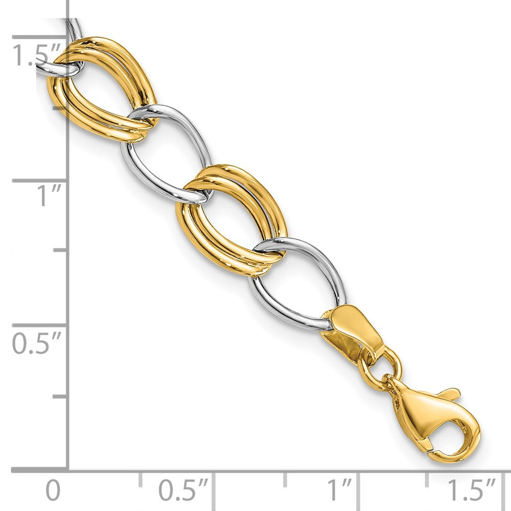 Specifications: Material: Primary - Purity:10K|Finish:Polished|Length of Item:7.5 in|Chain Length:7.5 in|Chain Width:8 mm|Clasp /Connector:Lobster (Fancy)|Feature:Hollow|Material: Primary:Gold|Width of Item:8 mm|Product Type:Jewelry|Jewelry Type:Bracelets|Sold By Unit:Each|Bracelet Type:Links|Material: Primary - Color:Two-Tone