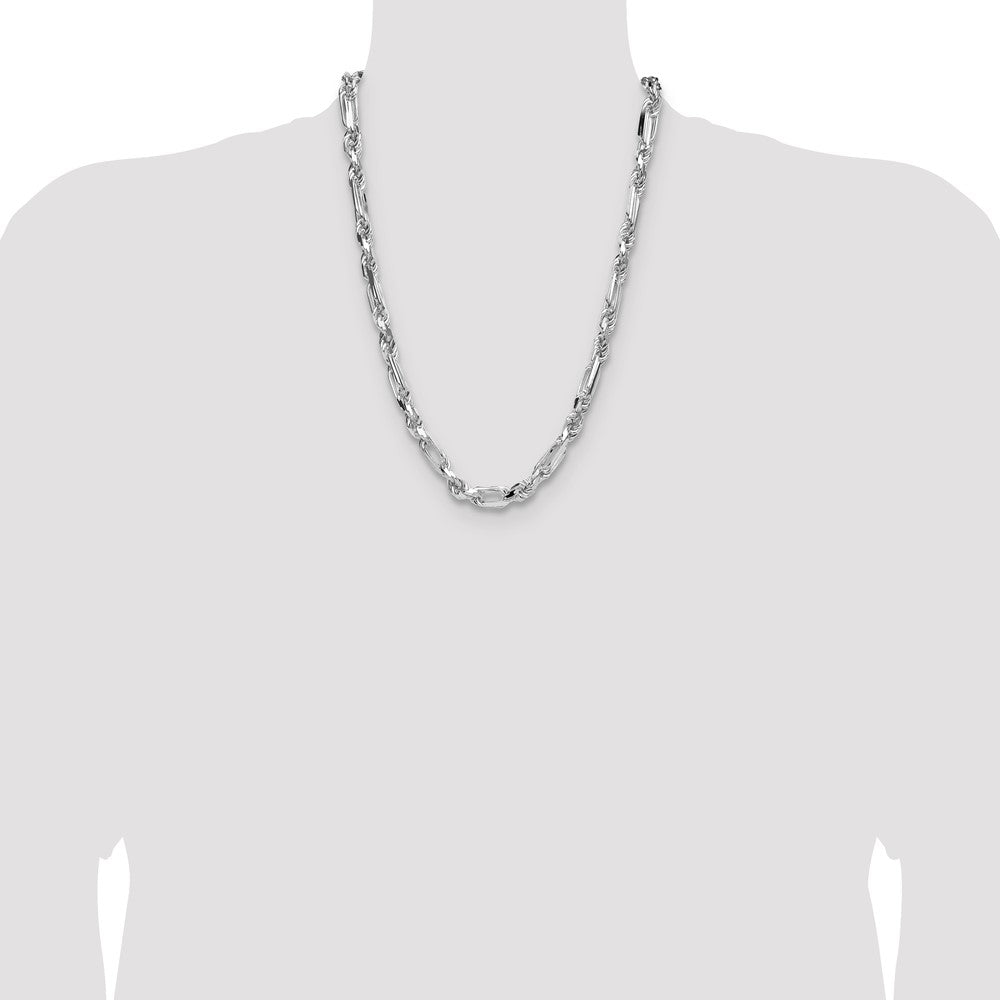 Specifications: Material: Primary - Purity:925|Finish:Polished|Length of Item:24 in|Chain Length:24 in|Chain Thickness:6.9 mm|Chain Type:Figaro|Chain Width:7 mm|Clasp /Connector:Lobster|Clasp Thickness (Female end):6.4 mm|Clasp Thickness (Male end):3.8 mm|Clasp Width (Female end):6.4 mm|Clasp Width (Male end):9.4 mm|Material: Primary:Sterling Silver|Width of Item:7 mm|Product Type:Jewelry|Jewelry Type:Necklaces|Sold By Unit:Each|Necklace Type:Chain Styles|Gender:Unisex|Texture:Diamond-cut|Material: Primary - Color:White|Chain Type 2:Rope