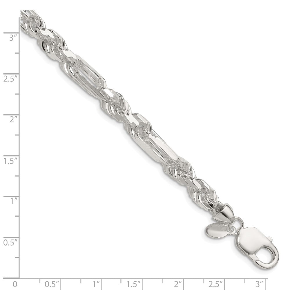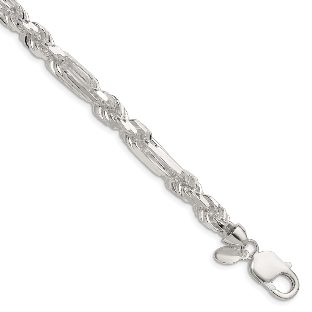 Specifications: Material: Primary - Purity:925|Finish:Polished|Length of Item:8 in|Chain Length:8 in|Chain Thickness:6.9 mm|Chain Type:Figaro|Chain Width:7 mm|Clasp /Connector:Lobster|Clasp Thickness (Female end):6.4 mm|Clasp Thickness (Male end):3.8 mm|Clasp Width (Female end):6.4 mm|Clasp Width (Male end):9.4 mm|Material: Primary:Sterling Silver|Width of Item:7 mm|Product Type:Jewelry|Jewelry Type:Bracelets|Sold By Unit:Each|Bracelet Type:Chain Styles|Gender:Unisex|Texture:Diamond-cut|Material: Primary - Color:White|Chain Type 2:Rope