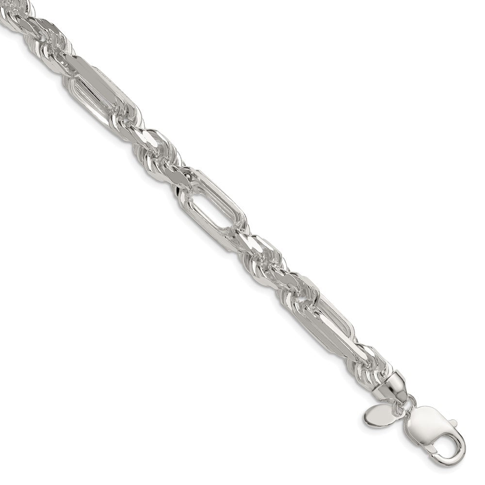 Specifications: Material: Primary - Purity:925|Finish:Polished|Length of Item:8 in|Chain Length:8 in|Chain Thickness:7.9 mm|Chain Type:Figaro|Chain Width:8 mm|Clasp /Connector:Lobster|Clasp Thickness (Female end):7.4 mm|Clasp Thickness (Male end):3.9 mm|Clasp Width (Female end):7.4 mm|Clasp Width (Male end):9.5 mm|Material: Primary:Sterling Silver|Width of Item:8 mm|Product Type:Jewelry|Jewelry Type:Bracelets|Sold By Unit:Each|Bracelet Type:Chain Styles|Gender:Unisex|Texture:Diamond-cut|Material: Primary - Color:White|Chain Type 2:Rope