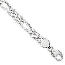 Specifications: Material: Primary - Purity:925|Finish:Polished|Length of Item:9 in|Chain Length:9 in|Chain Type:Figaro|Chain Width:8 mm|Clasp /Connector:Lobster|Clasp Thickness (Female end):3.4 mm|Clasp Thickness (Male end):3.6 mm|Clasp Width (Female end):7 mm|Clasp Width (Male end):6.3 mm|Coating:Anti-tarnish|Feature:Solid|Manufacturing Process:Casted|Material: Primary:Sterling Silver|Width of Item:8 mm|Product Type:Jewelry|Jewelry Type:Chains|Sold By Unit:Each|Bracelet Type:Chain Styles|Gender:Unisex|Material: Primary - Color:White