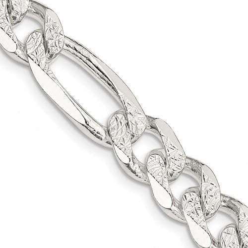 Specifications: Material: Primary - Purity:925|Finish:Polished|Length of Item:24 in|Chain Length:24 in|Chain Type:Figaro|Chain Width:9.5 mm|Clasp /Connector:Lobster|Coating:Anti-tarnish|Feature:Solid|Manufacturing Process:Casted|Material: Primary:Sterling Silver|Width of Item:9.5 mm|Product Type:Jewelry|Jewelry Type:Chains|Sold By Unit:Each|Necklace Type:Chain Styles|Gender:Unisex|Texture:Pave|Profile Type:Flat|Material: Primary - Color:White