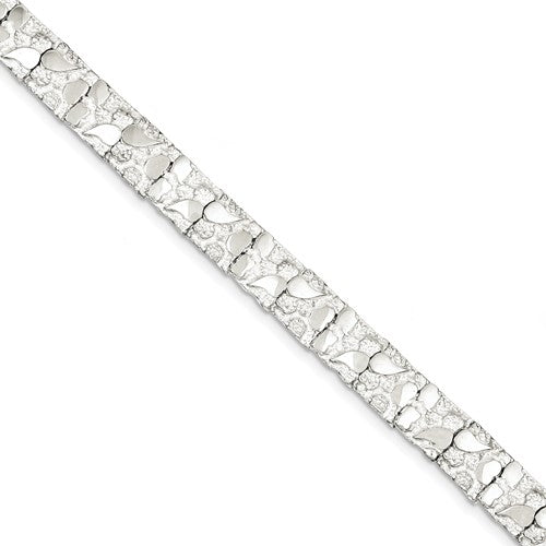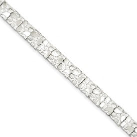 Specifications: Material: Primary - Purity:925|Finish:Polished|Length of Item:7 in|Chain Length:7 in|Chain Type:Link, Other|Chain Width:9 mm|Clasp /Connector:Fold Over Catch|Clasp Width (Male end):7 mm|Feature:Solid|Manufacturing Process:Casted|Material: Primary:Sterling Silver|Item Weight U/M:gm|Width of Item:9 mm|Product Type:Jewelry|Jewelry Type:Bracelets|Sold By Unit:Each|Bracelet Type:Nugget|Material: Primary - Color:White