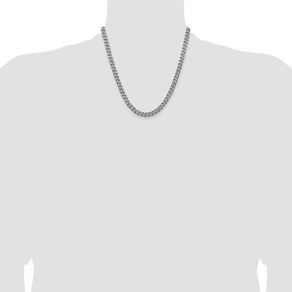 Specifications: Material: Primary - Purity:925|Finish:Antiqued|Length of Item:20 in|Chain Length:20 in|Chain Type:Curb|Chain Width:6 mm|Clasp /Connector:Lobster|Clasp Thickness (Female end):2.9 mm|Clasp Thickness (Male end):2.8 mm|Clasp Width (Female end):4.9 mm|Clasp Width (Male end):5.4 mm|Feature:Solid|Manufacturing Process:Casted|Material: Primary:Sterling Silver|Width of Item:6 mm|Product Type:Jewelry|Jewelry Type:Necklaces|Sold By Unit:Each|Necklace Type:Chain Styles|Gender:Unisex|Material: Primary - Color:White