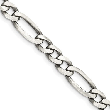 Specifications: Material: Primary - Purity:925|Finish:Antiqued|Length of Item:28 in|Chain Length:28 in|Chain Type:Figaro|Chain Width:6.5 mm|Clasp /Connector:Lobster|Clasp Thickness (Female end):3 mm|Clasp Thickness (Male end):2.8 mm|Clasp Width (Female end):5.4 mm|Clasp Width (Male end):5.4 mm|Feature:Solid|Material: Primary:Sterling Silver|Width of Item:6.5 mm|Product Type:Jewelry|Jewelry Type:Chains|Sold By Unit:Each|Necklace Type:Chain Styles|Gender:Unisex|Material: Primary - Color:White