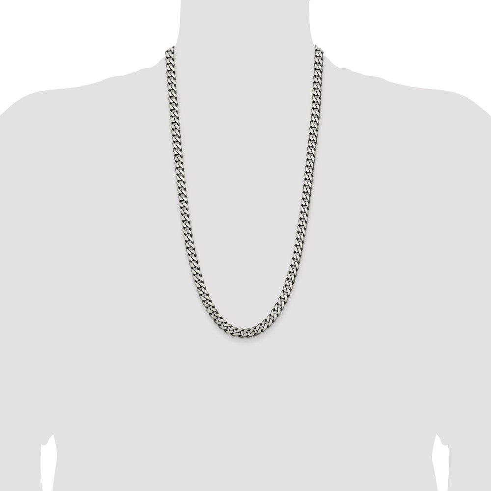 Specifications: Material: Primary - Purity:925|Finish:Antiqued|Length of Item:28 in|Chain Length:28 in|Chain Type:Curb|Chain Width:7.5 mm|Clasp /Connector:Lobster|Clasp Thickness (Female end):3.2 mm|Clasp Thickness (Male end):3.5 mm|Clasp Width (Female end):6.4 mm|Clasp Width (Male end):6.3 mm|Feature:Solid|Manufacturing Process:Casted|Material: Primary:Sterling Silver|Width of Item:7.5 mm|Product Type:Jewelry|Jewelry Type:Necklaces|Sold By Unit:Each|Necklace Type:Chain Styles|Gender:Unisex|Material: Primary - Color:White