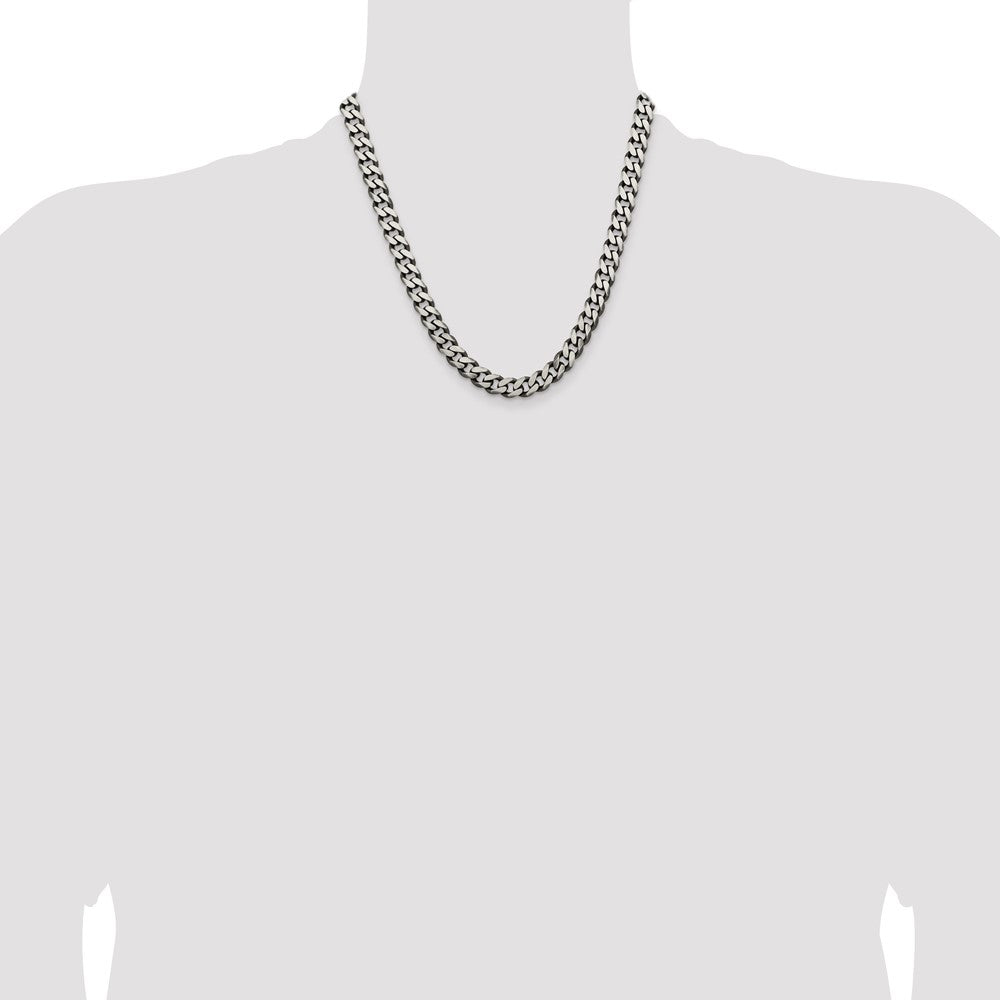 Specifications: Material: Primary - Purity:925|Finish:Antiqued|Length of Item:20 in|Chain Length:20 in|Chain Type:Curb|Chain Width:9.3 mm|Clasp /Connector:Lobster|Clasp Thickness (Female end):4.2 mm|Clasp Thickness (Male end):4 mm|Clasp Width (Female end):9.1 mm|Clasp Width (Male end):9 mm|Feature:Solid|Manufacturing Process:Casted|Material: Primary:Sterling Silver|Width of Item:9.3 mm|Product Type:Jewelry|Jewelry Type:Necklaces|Sold By Unit:Each|Necklace Type:Chain Styles|Gender:Unisex|Material: Primary - Color:White
