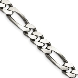 Specifications: Material: Primary - Purity:925|Finish:Antiqued|Length of Item:22 in|Chain Length:22 in|Chain Type:Figaro|Chain Width:9 mm|Clasp /Connector:Lobster|Clasp Thickness (Female end):3.5 mm|Clasp Thickness (Male end):4 mm|Clasp Width (Female end):9 mm|Clasp Width (Male end):9 mm|Feature:Solid|Material: Primary:Sterling Silver|Width of Item:9 mm|Product Type:Jewelry|Jewelry Type:Chains|Sold By Unit:Each|Necklace Type:Chain Styles|Gender:Unisex|Material: Primary - Color:White