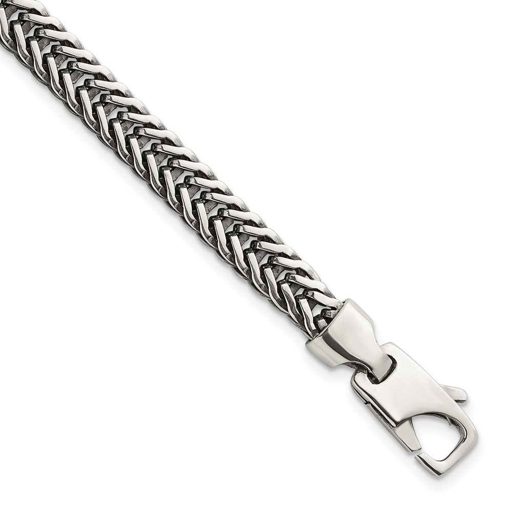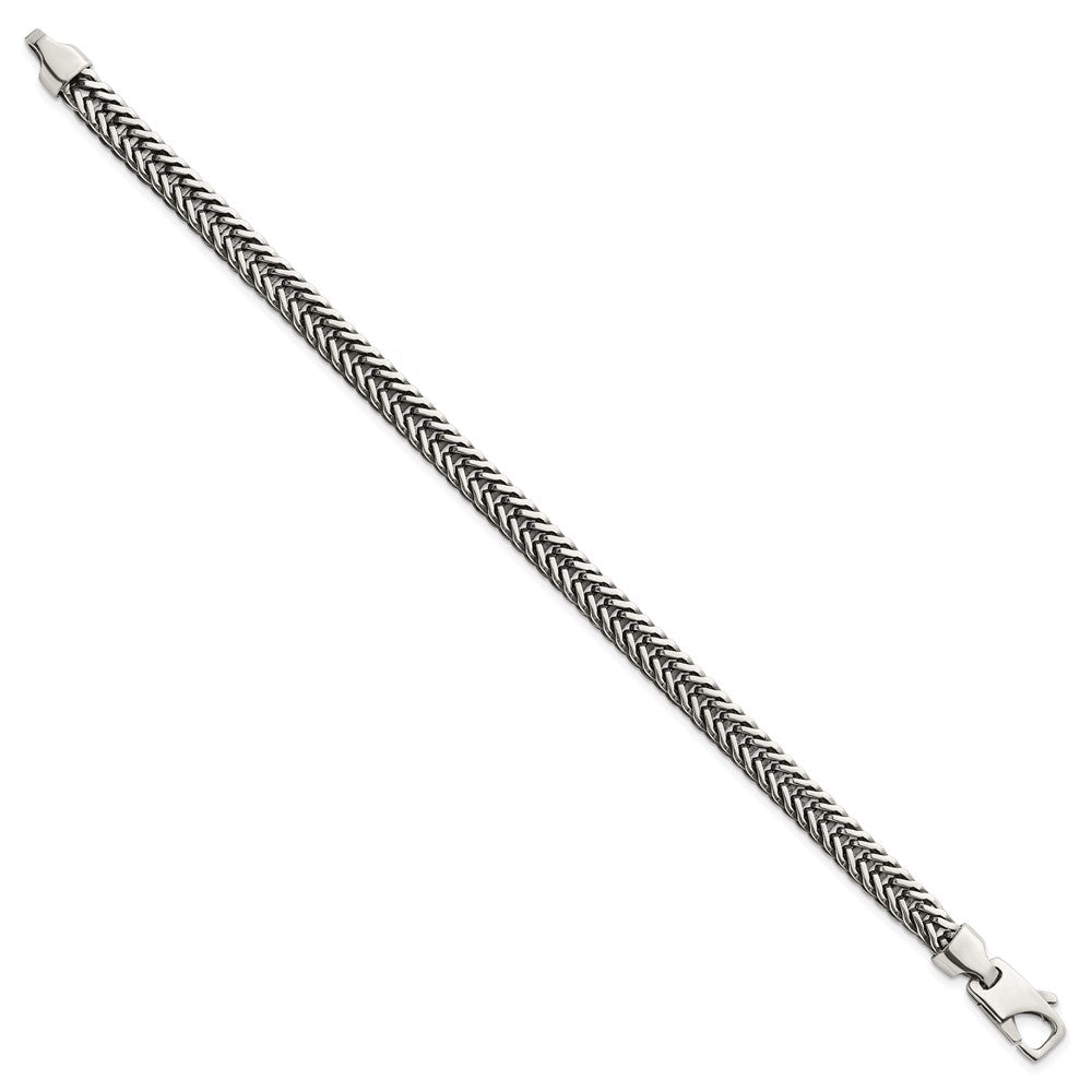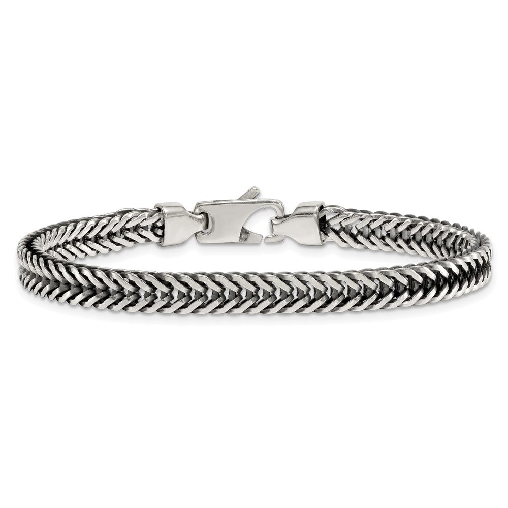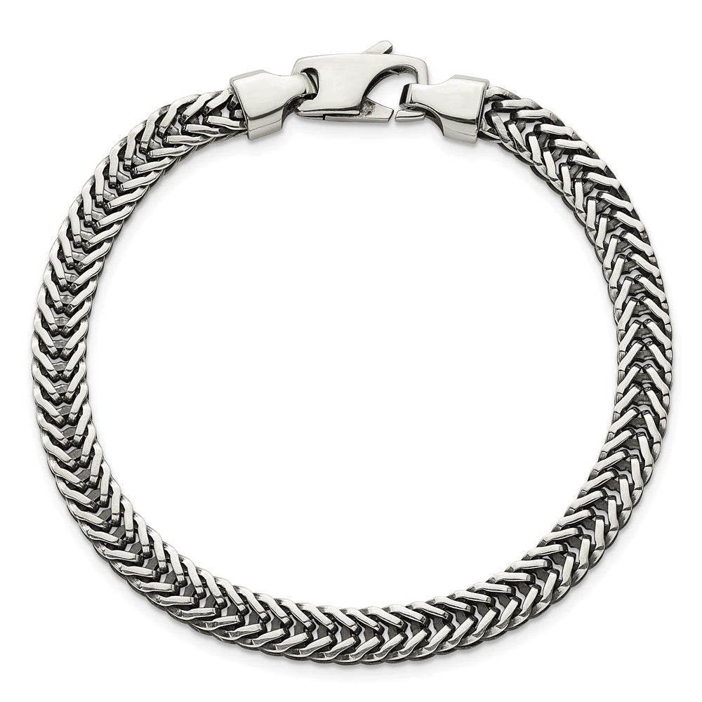 Specifications: Material: Primary - Purity:925|Finish:Polished & Antiqued|Length of Item:8 in|Chain Length:8 in|Chain Type:Other Chains|Chain Width:6.1 mm|Clasp /Connector:Lobster (Fancy)|Clasp Thickness (Female end):5 mm|Clasp Thickness (Male end):3.9 mm|Clasp Width (Female end):5 mm|Clasp Width (Male end):9.4 mm|Feature:Solid|Material: Primary:Sterling Silver|Width of Item:6.1 mm|Product Type:Jewelry|Jewelry Type:Chains|Sold By Unit:Each|Bracelet Type:Chain Styles|Gender:Men's|Texture:Textured|Material: Primary - Color:White