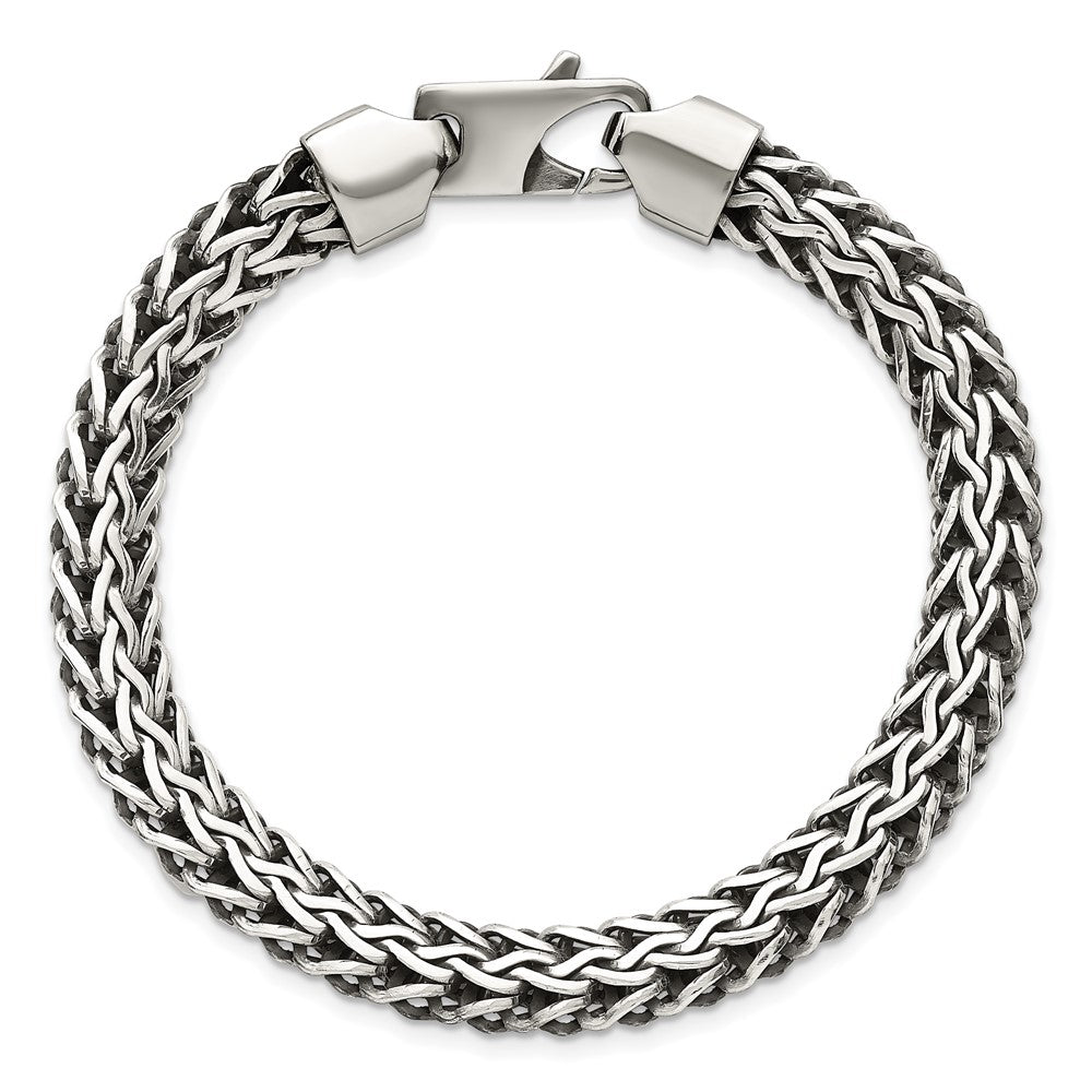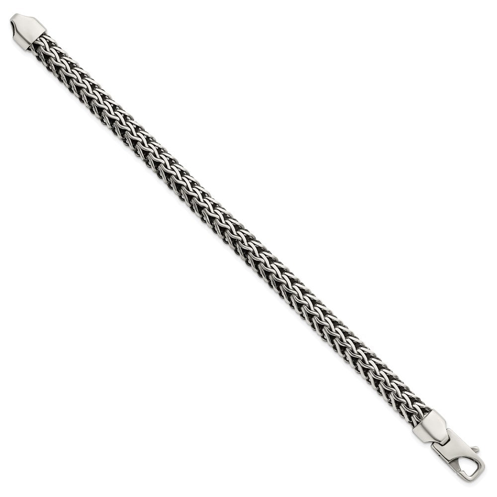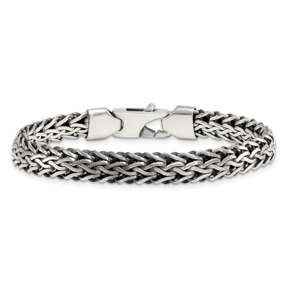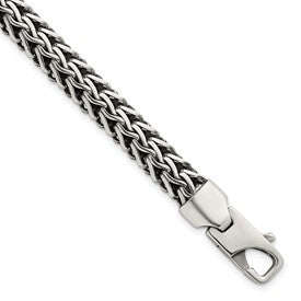 Specifications: Material: Primary - Purity:925|Finish:Polished & Antiqued|Length of Item:7.75 in|Chain Length:7.75 in|Chain Type:Spiga (Wheat)|Chain Width:8.2 mm|Clasp /Connector:Lobster (Fancy)|Clasp Thickness (Female end):5.1 mm|Clasp Thickness (Male end):3.4 mm|Clasp Width (Female end):5.1 mm|Clasp Width (Male end):10 mm|Feature:Solid|Material: Primary:Sterling Silver|Width of Item:8.2 mm|Product Type:Jewelry|Jewelry Type:Chains|Sold By Unit:Each|Bracelet Type:Chain Styles|Gender:Men's|Texture:Textured|Material: Primary - Color:White
