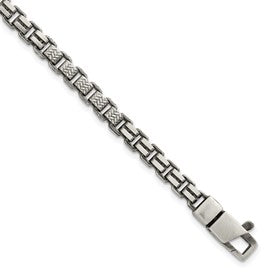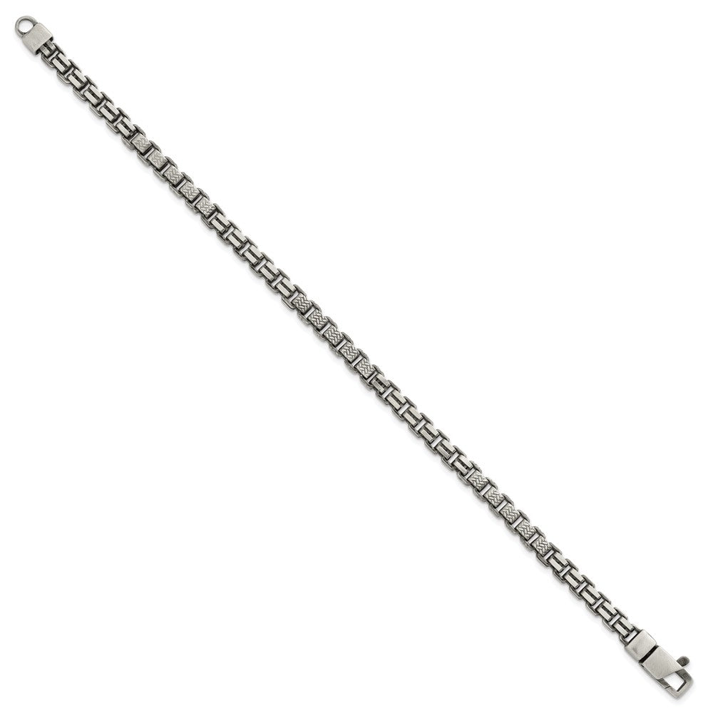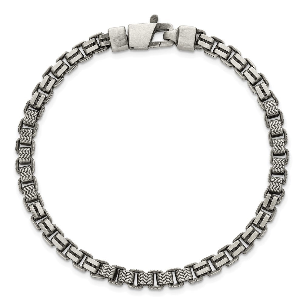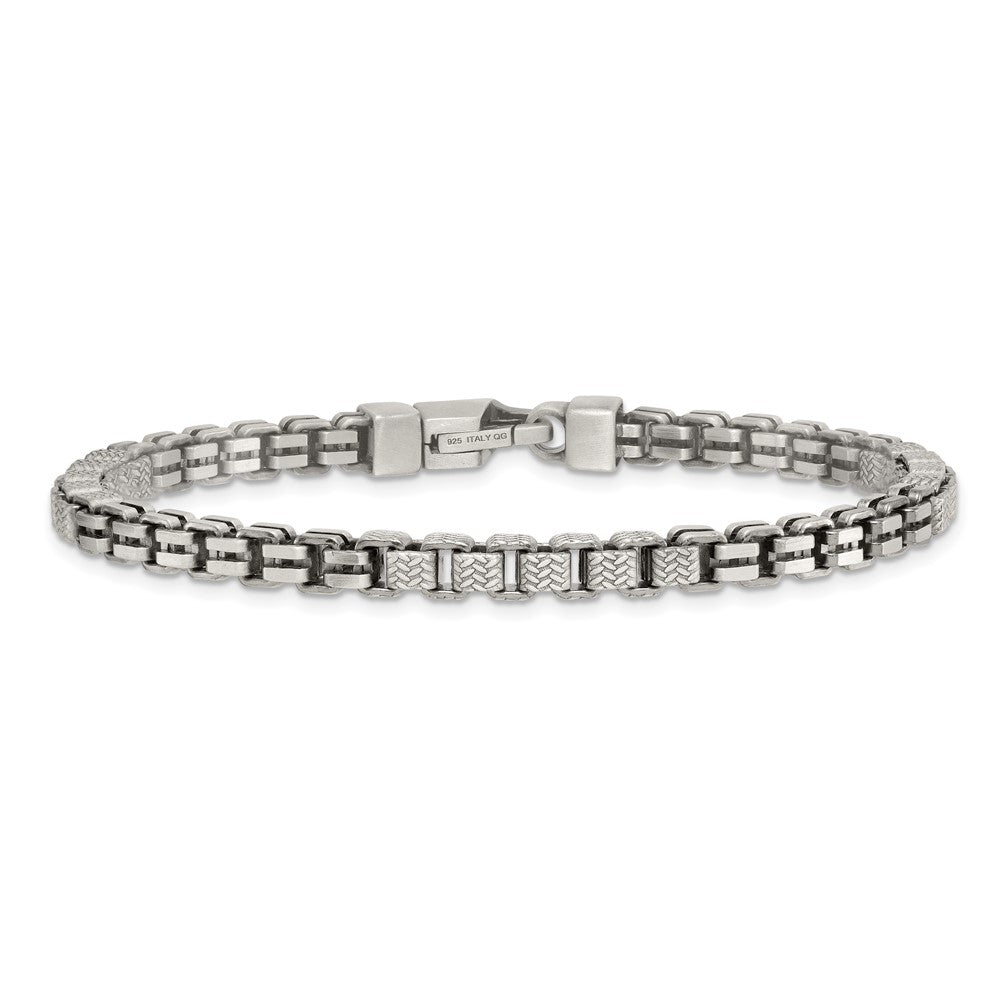 Specifications: Material: Primary - Purity:925|Finish:Brushed|Length of Item:8.5 in|Plating:Ruthenium|Chain Length:8.5 in|Chain Type:Box|Chain Width:5 mm|Clasp /Connector:Lobster (Fancy)|Clasp Thickness (Female end):6.1 mm|Clasp Thickness (Male end):5.2 mm|Clasp Width (Female end):6.1 mm|Clasp Width (Male end):9 mm|Feature:Solid|Material: Primary:Sterling Silver|Width of Item:5 mm|Product Type:Jewelry|Jewelry Type:Chains|Sold By Unit:Each|Bracelet Type:Chain Styles|Gender:Men's|Texture:Textured|Material: Primary - Color:White|Plating Color:Black