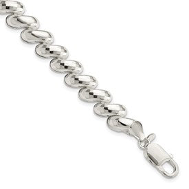 Specifications: Material: Primary - Purity:925|Finish:Polished|Length of Item:7.5 in|Chain Length:7.5 in|Chain Type:Link, Other|Chain Width:9.4 mm|Clasp /Connector:Lobster|Feature:Hollow|Material: Primary:Sterling Silver|Width of Item:9.4 mm|Product Type:Jewelry|Jewelry Type:Bracelets|Sold By Unit:Each|Bracelet Type:Links|Texture:Diamond-cut|Material: Primary - Color:White