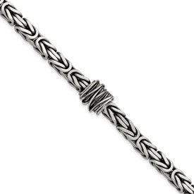 Specifications: Material: Primary - Purity:925|Finish:Antiqued & Brushed|Length of Item:8.5 in|Material: Accents:Rhodium|Material: Accent Color 1:Black|Chain Length:8.5 in|Chain Type:Byzantine|Chain Width:10.1 mm|Clasp /Connector:Lobster (Fancy)|Clasp Thickness (Female end):1.3 mm|Clasp Thickness (Male end):4.75 mm|Clasp Width (Female end):6.4 mm|Clasp Width (Male end):10.65 mm|Material: Primary:Sterling Silver|Width of Item:10.1 mm|Product Type:Jewelry|Jewelry Type:Chains|Sold By Unit:Each|Bracelet Type:Chain Styles|Gender:Men's|Material: Primary - Color:White