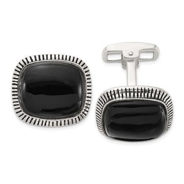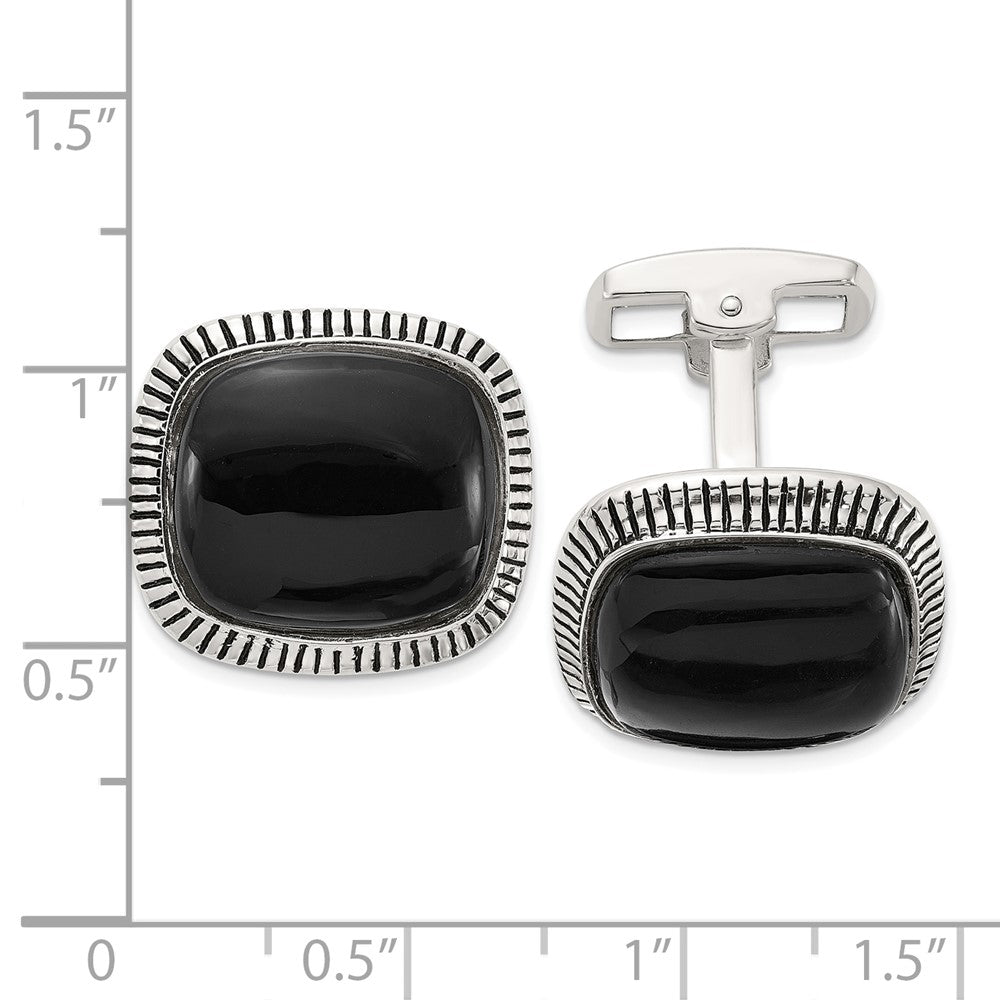 Specifications: Material: Primary - Purity:925|Finish:Polished|Stone Type_1:Onyx|Stone Color_1:Black|Stone Quantity_1:2|Length of Item:15.9 mm|Material: Accents:Enamel|Material: Accent Color 1:Black|Material: Primary:Sterling Silver|Width of Item:17.4 mm|Accessory Type:Cuff Links|Engravable:Not Recommended|Product Type:Accessory|Sold By Unit:Pair|Gender:Men's|Texture:Textured|Material: Primary - Color:White|Stone Creation Method_1:Natural