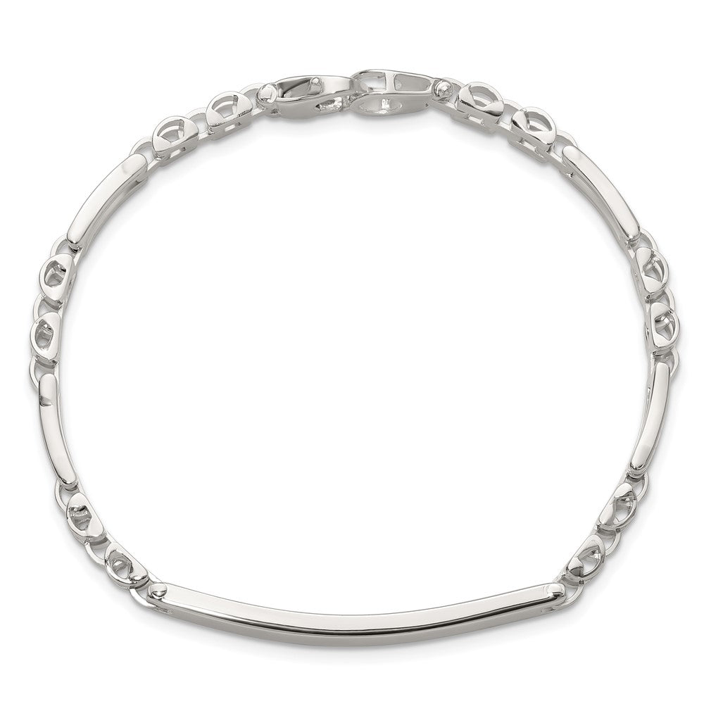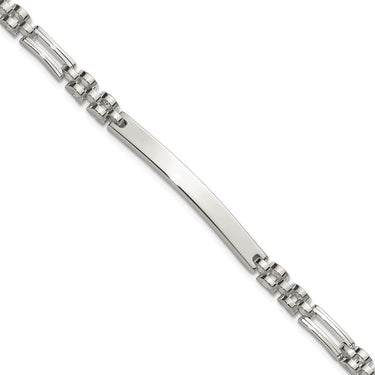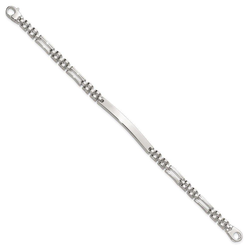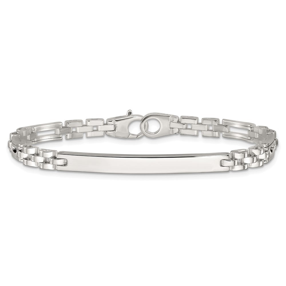Specifications: Material: Primary - Purity:925|Finish:Polished|Length of Item:7.5 in|Chain Length:7.5 in|Chain Type:Link, Other|Chain Width:4.7 mm|Charm/Element Length:44 mm|Charm/Element Thickness:2.6 mm|Charm/Element Width:4.8 mm|Clasp /Connector:Lobster (Fancy)|Material: Primary:Sterling Silver|Width of Item:4.7 mm|Engravable:Yes|Product Type:Jewelry|Jewelry Type:Bracelets|Sold By Unit:Each|Bracelet Type:ID Bracelets|Pendant/Charm Type:Bar|Gender:Men's|Material: Primary - Color:White