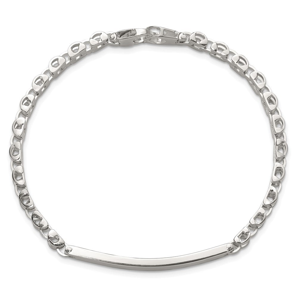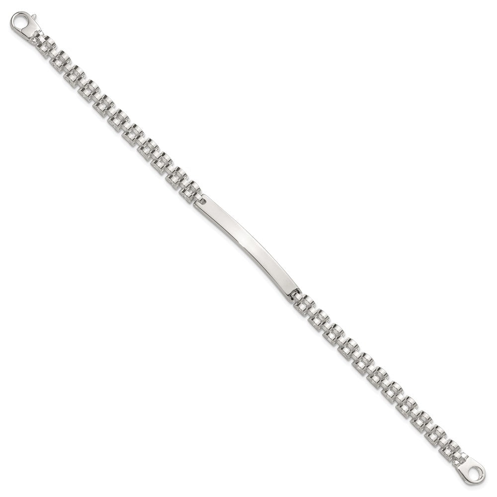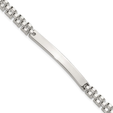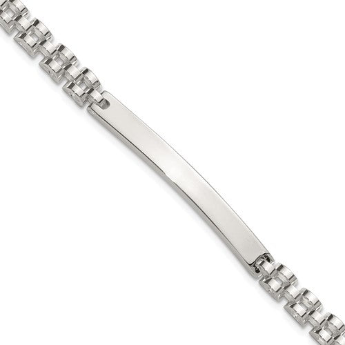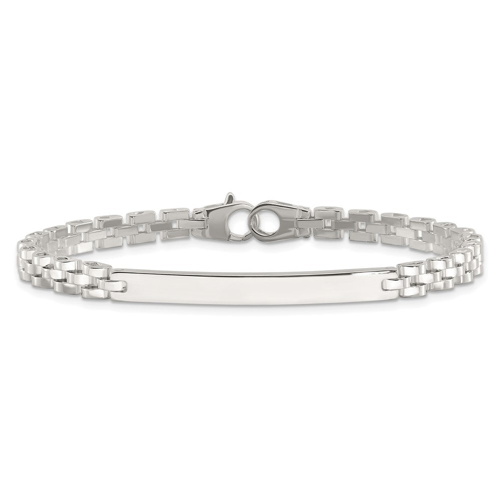 Specifications: Material: Primary - Purity:925|Finish:Polished|Length of Item:8 in|Chain Length:8 in|Chain Type:Link, Other|Chain Width:4.7 mm|Charm/Element Length:44 mm|Charm/Element Thickness:2.6 mm|Charm/Element Width:4.8 mm|Clasp /Connector:Lobster (Fancy)|Material: Primary:Sterling Silver|Width of Item:4.7 mm|Engravable:Yes|Product Type:Jewelry|Jewelry Type:Bracelets|Sold By Unit:Each|Bracelet Type:ID Bracelets|Pendant/Charm Type:Bar|Gender:Men's|Material: Primary - Color:White