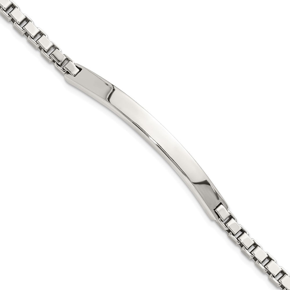 Specifications: Material: Primary - Purity:925|Finish:Polished|Length of Item:7 in|Chain Length:7 in|Chain Type:Box|Chain Width:3.85 mm|Charm/Element Length:49.45 mm|Charm/Element Width:4.75 mm|Clasp /Connector:Lobster (Fancy)|Material: Primary:Sterling Silver|Width of Item:4.75 mm|Engravable:Yes|Product Type:Jewelry|Jewelry Type:Bracelets|Sold By Unit:Each|Bracelet Type:ID Bracelets|Gender:Women's|Material: Primary - Color:White