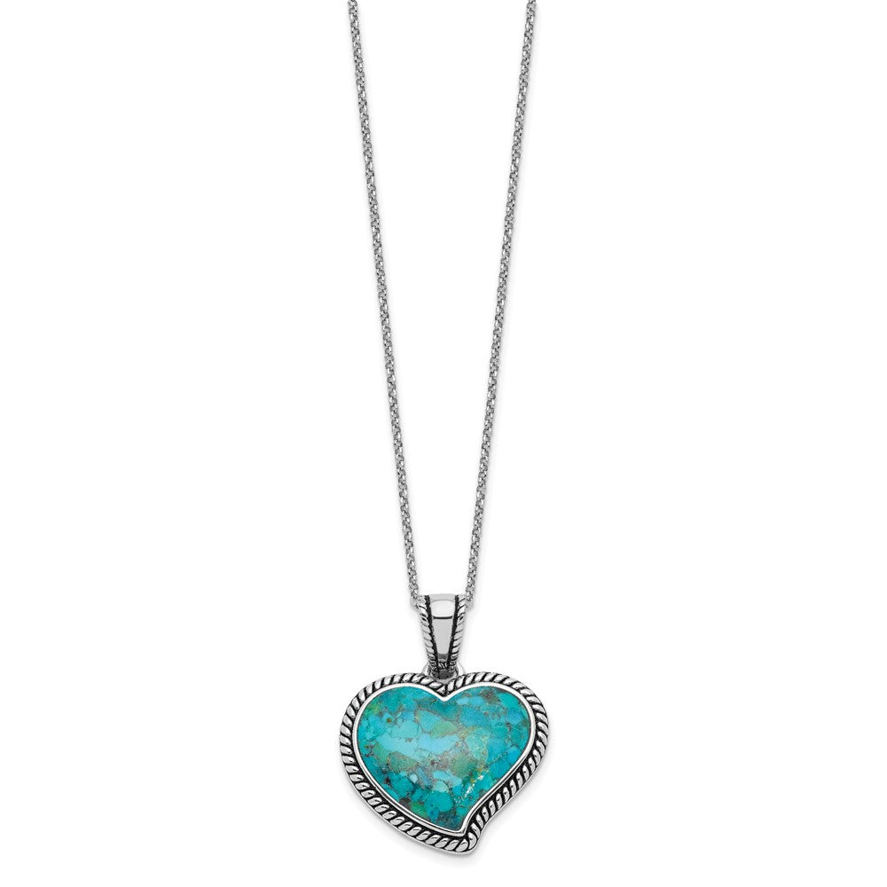 Specifications: Material: Primary - Purity:925|Finish:Polished & Antiqued|Stone Type_1:Turquoise|Stone Color_1:Blue|Stone Quantity_1:1|Length of Item:17.75 in|Chain Length:16 in|Chain Width:1.4 mm|Charm/Element Length:25.8 mm|Charm/Element Width:29.3 mm|Clasp /Connector:Lobster (Fancy)|Extender Length:1.75 in|Material: Primary:Sterling Silver|Stone Treatment_1:Impregnation|Width of Item:29.3 mm|Product Type:Jewelry|Jewelry Type:Necklaces|Sold By Unit:Each|Necklace Type:Natural Stone|Pendant/Charm Type:Themed|Gender:Women's|Material: Primary - Color:White|Number of Elements:1|Plating Color:Silver Tone|Plating: Chain:Rhodium|Plating: Charm/Element:Rhodium