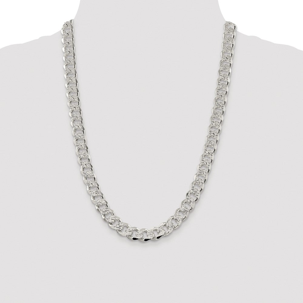 Specifications: Material: Primary - Purity:925|Finish:Polished|Length of Item:24 in|Plating:Rhodium|Chain Length:24 in|Chain Type:Curb|Chain Width:11 mm|Clasp /Connector:Lobster|Material: Primary:Sterling Silver|Width of Item:11 mm|Product Type:Jewelry|Jewelry Type:Necklaces|Sold By Unit:Each|Necklace Type:Chain Styles|Gender:Unisex|Texture:Pave|Material: Primary - Color:White|Plating Color:Silver Tone