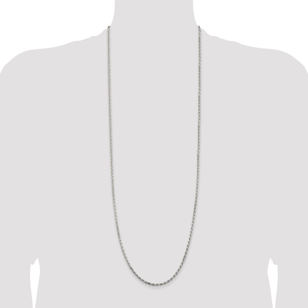 Specifications: Material: Primary - Purity:925|Finish:Polished|Length of Item:36 in|Plating:Rhodium|Chain Length:36 in|Chain Type:Rope|Chain Width:2.5 mm|Clasp /Connector:Lobster|Feature:Solid|Manufacturing Process:Machine Made|Material: Primary:Sterling Silver|Width of Item:2.5 mm|Product Type:Jewelry|Jewelry Type:Necklaces|Sold By Unit:Each|Necklace Type:Chain Styles|Gender:Unisex|Texture:Diamond-cut|Material: Primary - Color:White|Plating Color:Silver Tone|Plating: Chain:Rhodium