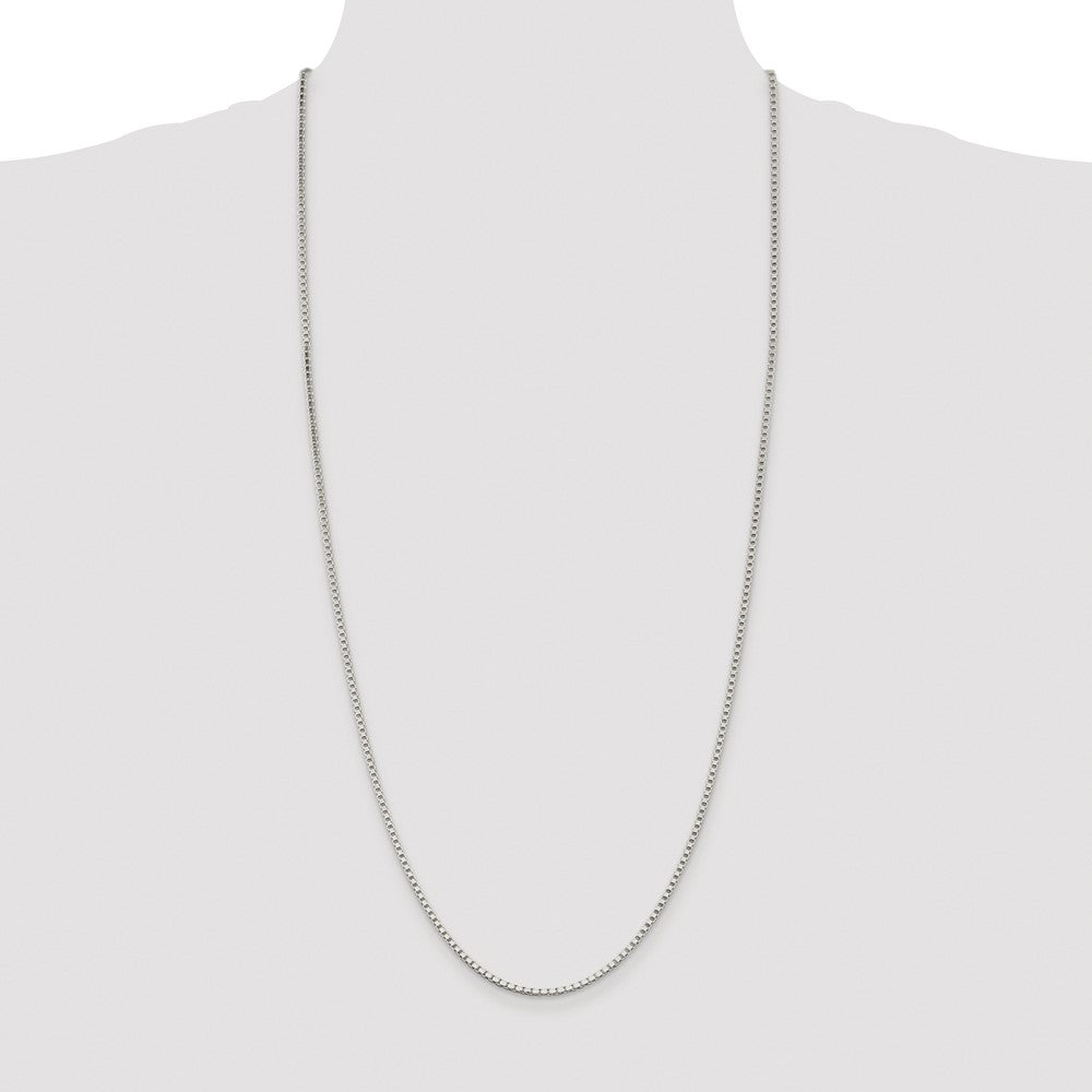 Specifications: Material: Primary - Purity:925|Finish:Polished|Length of Item:30 in|Plating:Rhodium|Chain Length:30 in|Chain Type:Box|Chain Width:2 mm|Clasp /Connector:Lobster|Material: Primary:Sterling Silver|Width of Item:2 mm|Product Type:Jewelry|Jewelry Type:Necklaces|Sold By Unit:Each|Necklace Type:Chain Styles|Gender:Unisex|Material: Primary - Color:White|Plating Color:Silver Tone