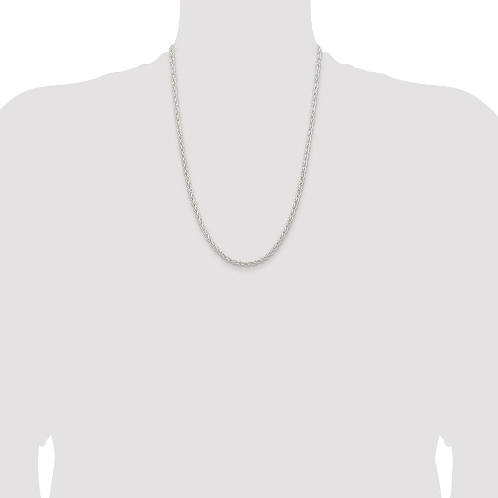 Specifications: Material: Primary - Purity:925|Finish:Polished|Length of Item:24 in|Plating:Rhodium|Chain Length:24 in|Chain Type:Spiga (Wheat)|Chain Width:3.7 mm|Clasp /Connector:Lobster|Clasp Thickness (Female end):4.75 mm|Clasp Thickness (Male end):2.8 mm|Clasp Width (Female end):4.6 mm|Clasp Width (Male end):5.2 mm|Material: Primary:Sterling Silver|Width of Item:3.7 mm|Product Type:Jewelry|Jewelry Type:Necklaces|Sold By Unit:Each|Necklace Type:Chain Styles|Gender:Unisex|Profile Type:Round|Material: Primary - Color:White|Plating Color:Silver Tone