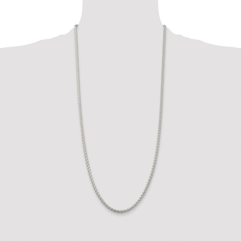 Specifications: Material: Primary - Purity:925|Finish:Polished|Length of Item:30 in|Plating:Rhodium|Chain Length:30 in|Chain Type:Spiga (Wheat)|Chain Width:3 mm|Clasp /Connector:Lobster|Material: Primary:Sterling Silver|Width of Item:3 mm|Product Type:Jewelry|Jewelry Type:Necklaces|Sold By Unit:Each|Necklace Type:Chain Styles|Gender:Unisex|Profile Type:Round|Material: Primary - Color:White|Plating Color:Silver Tone