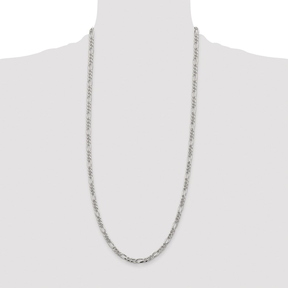 Specifications: Material: Primary - Purity:925|Finish:Polished|Length of Item:30 in|Plating:Rhodium|Chain Length:30 in|Chain Type:Figaro|Chain Width:4.75 mm|Clasp /Connector:Lobster|Material: Primary:Sterling Silver|Width of Item:4.75 mm|Product Type:Jewelry|Jewelry Type:Chains|Sold By Unit:Each|Necklace Type:Chain Styles|Gender:Unisex|Texture:Pave|Profile Type:Flat|Material: Primary - Color:White|Plating Color:Silver Tone