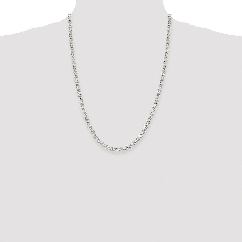Specifications: Material: Primary - Purity:925|Finish:Polished|Length of Item:24 in|Plating:Rhodium|Chain Length:24 in|Chain Type:Rolo|Chain Width:4 mm|Clasp /Connector:Lobster|Material: Primary:Sterling Silver|Width of Item:4 mm|Product Type:Jewelry|Jewelry Type:Necklaces|Sold By Unit:Each|Necklace Type:Chain Styles|Gender:Unisex|Texture:Diamond-cut|Material: Primary - Color:White|Plating Color:Silver Tone