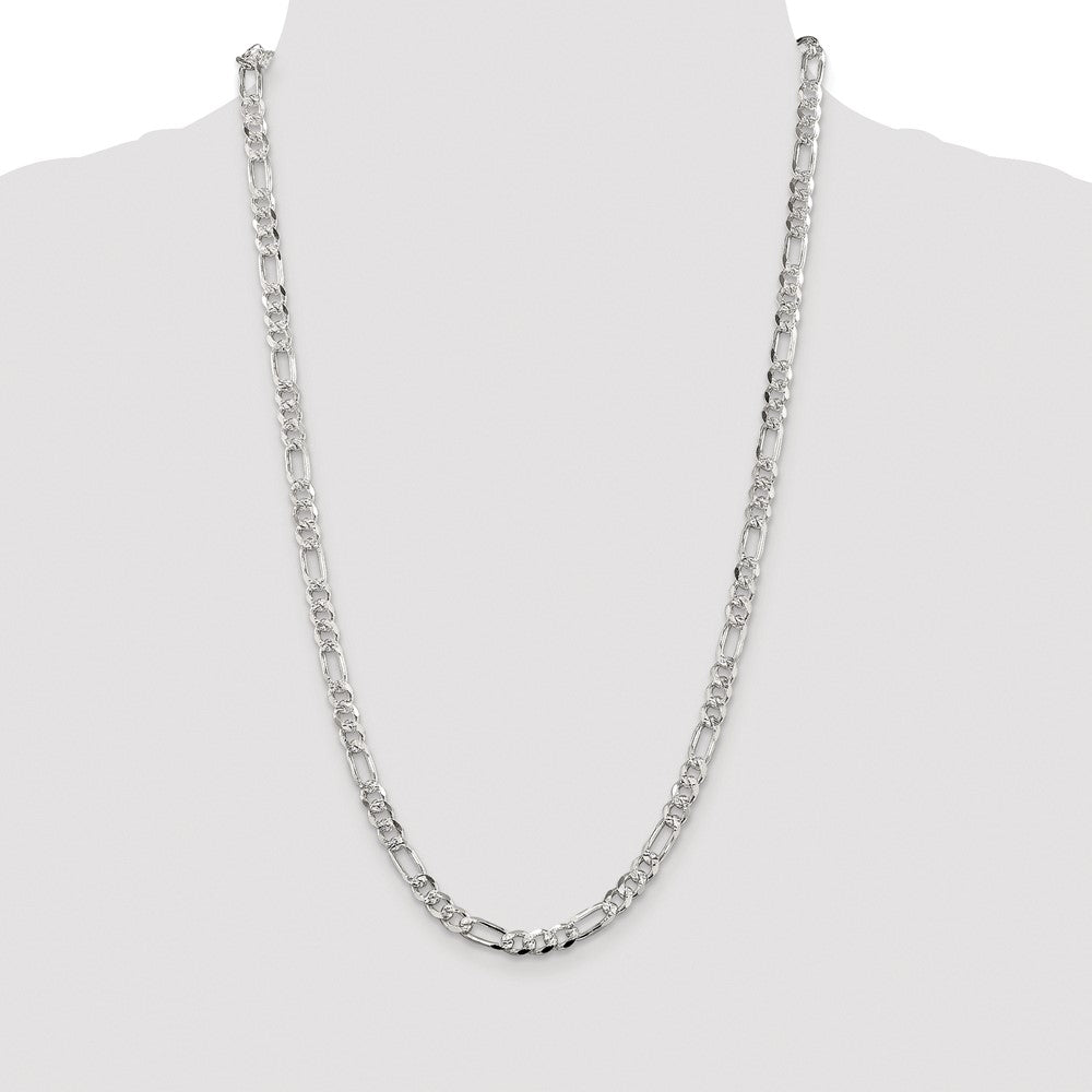 Specifications: Material: Primary - Purity:925|Finish:Polished|Length of Item:26 in|Plating:Rhodium|Chain Length:26 in|Chain Type:Figaro|Chain Width:5.5 mm|Clasp /Connector:Lobster|Material: Primary:Sterling Silver|Width of Item:5.5 mm|Product Type:Jewelry|Jewelry Type:Chains|Sold By Unit:Each|Necklace Type:Chain Styles|Gender:Unisex|Texture:Pave|Profile Type:Flat|Material: Primary - Color:White|Plating Color:Silver Tone