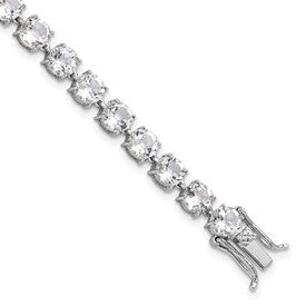 Specifications: Material: Primary - Purity:925|Finish:Polished|Stone Type_1:White Topaz|Stone Color_1:White|Stone Quantity_1:28|Length of Item:8 in|Plating:Rhodium|Chain Length:8 in|Chain Type:Fancy|Clasp /Connector:Box Catch|Feature:Solid|Material: Primary:Sterling Silver|Completeness:Complete (all stones included)|Width of Item:5.03 mm|Product Type:Jewelry|Jewelry Type:Bracelets|Sold By Unit:Each|Bracelet Type:Gemstones|Gender:Women's|Profile Type:Open Back|Material: Primary - Color:White|Plating Color:Silver Tone