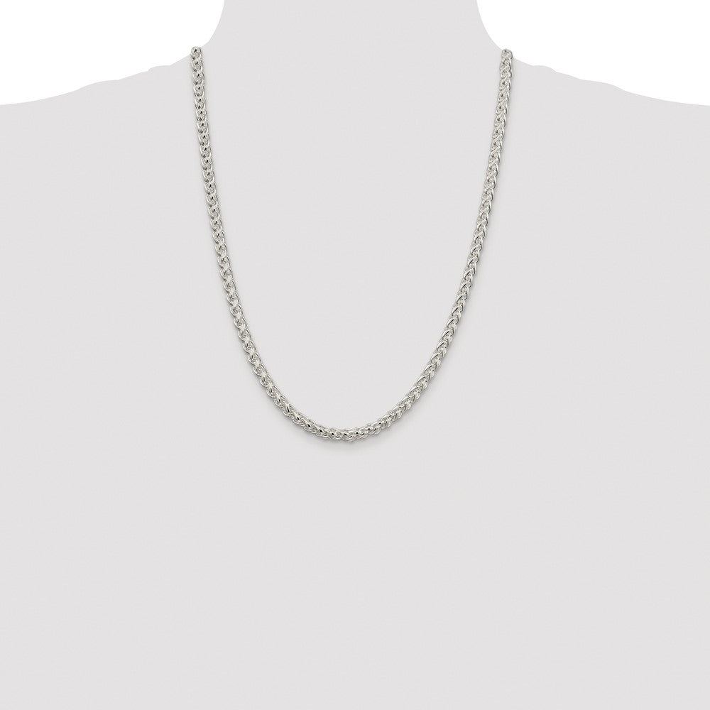 Specifications: Material: Primary - Purity:925|Finish:Polished|Length of Item:24 in|Plating:Rhodium|Chain Length:24 in|Chain Type:Spiga (Wheat)|Chain Width:5 mm|Clasp /Connector:Lobster|Material: Primary:Sterling Silver|Width of Item:5 mm|Product Type:Jewelry|Jewelry Type:Necklaces|Sold By Unit:Each|Necklace Type:Chain Styles|Gender:Unisex|Profile Type:Round|Material: Primary - Color:White|Plating Color:Silver Tone