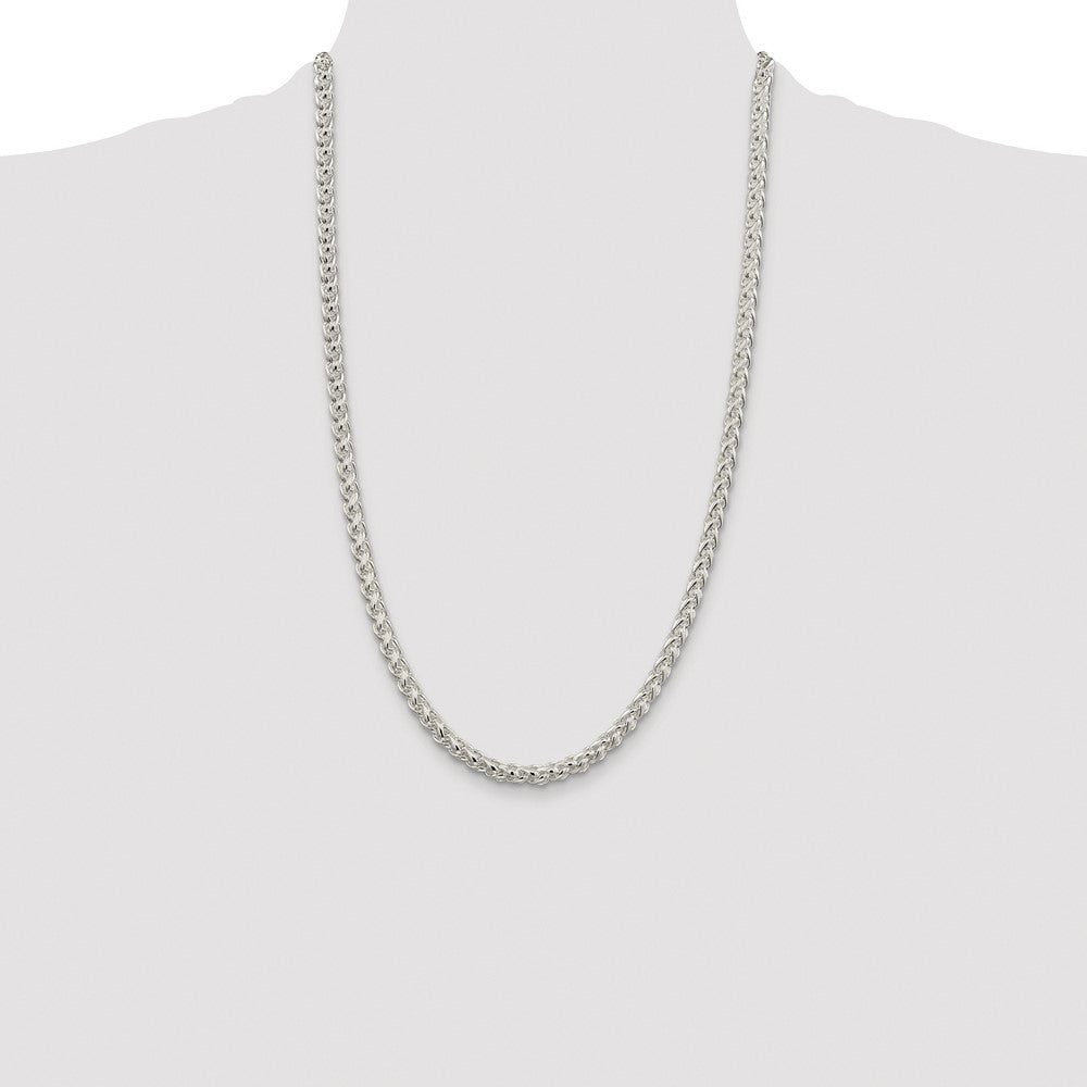 Specifications: Material: Primary - Purity:925|Finish:Polished|Length of Item:26 in|Plating:Rhodium|Chain Length:26 in|Chain Type:Spiga (Wheat)|Chain Width:5 mm|Clasp /Connector:Lobster|Material: Primary:Sterling Silver|Width of Item:5 mm|Product Type:Jewelry|Jewelry Type:Necklaces|Sold By Unit:Each|Necklace Type:Chain Styles|Gender:Unisex|Profile Type:Round|Material: Primary - Color:White|Plating Color:Silver Tone