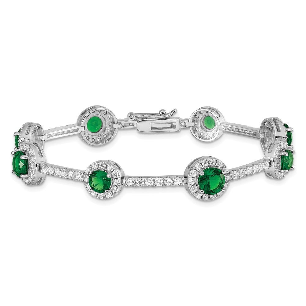 Specifications: Material: Primary - Purity:925|Finish:Polished|Stone Type_1:Cubic Zirconia (CZ)|Stone Type_2:Cubic Zirconia (CZ)|Stone Color_1:Green|Stone Color_2:White|Length of Item:7.25 in|Plating:Rhodium|Chain Length:7.25 in|Chain Type:Fancy|Chain Width:10 mm|Clasp /Connector:Box Catch|Feature:Solid|Material: Primary:Sterling Silver|Completeness:Complete (all stones included)|Stone Treatment_1:Synthetic|Stone Treatment_2:Synthetic|Product Type:Jewelry|Jewelry Type:Bracelets|Sold By Unit:Each|Bracelet Type:CZ Bracelets|Gender:Women's|Material: Primary - Color:White|Stone Creation Method_1:Synthetic|Stone Creation Method_2:Synthetic