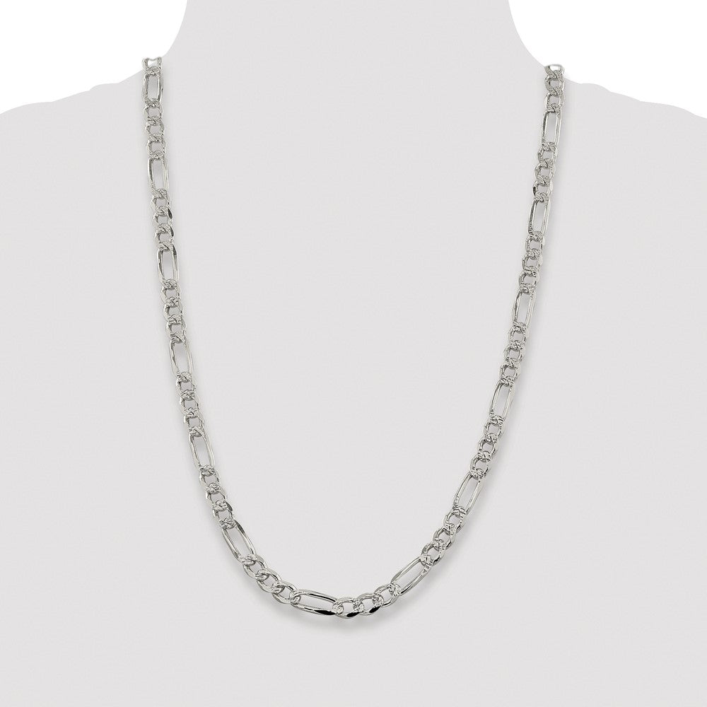 Specifications: Material: Primary - Purity:925|Finish:Polished|Length of Item:26 in|Plating:Rhodium|Chain Length:26 in|Chain Type:Figaro|Chain Width:7.25 mm|Clasp /Connector:Lobster|Material: Primary:Sterling Silver|Width of Item:7.25 mm|Product Type:Jewelry|Jewelry Type:Chains|Sold By Unit:Each|Necklace Type:Chain Styles|Gender:Unisex|Texture:Pave|Profile Type:Flat|Material: Primary - Color:White|Plating Color:Silver Tone