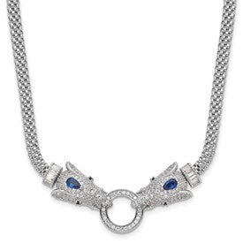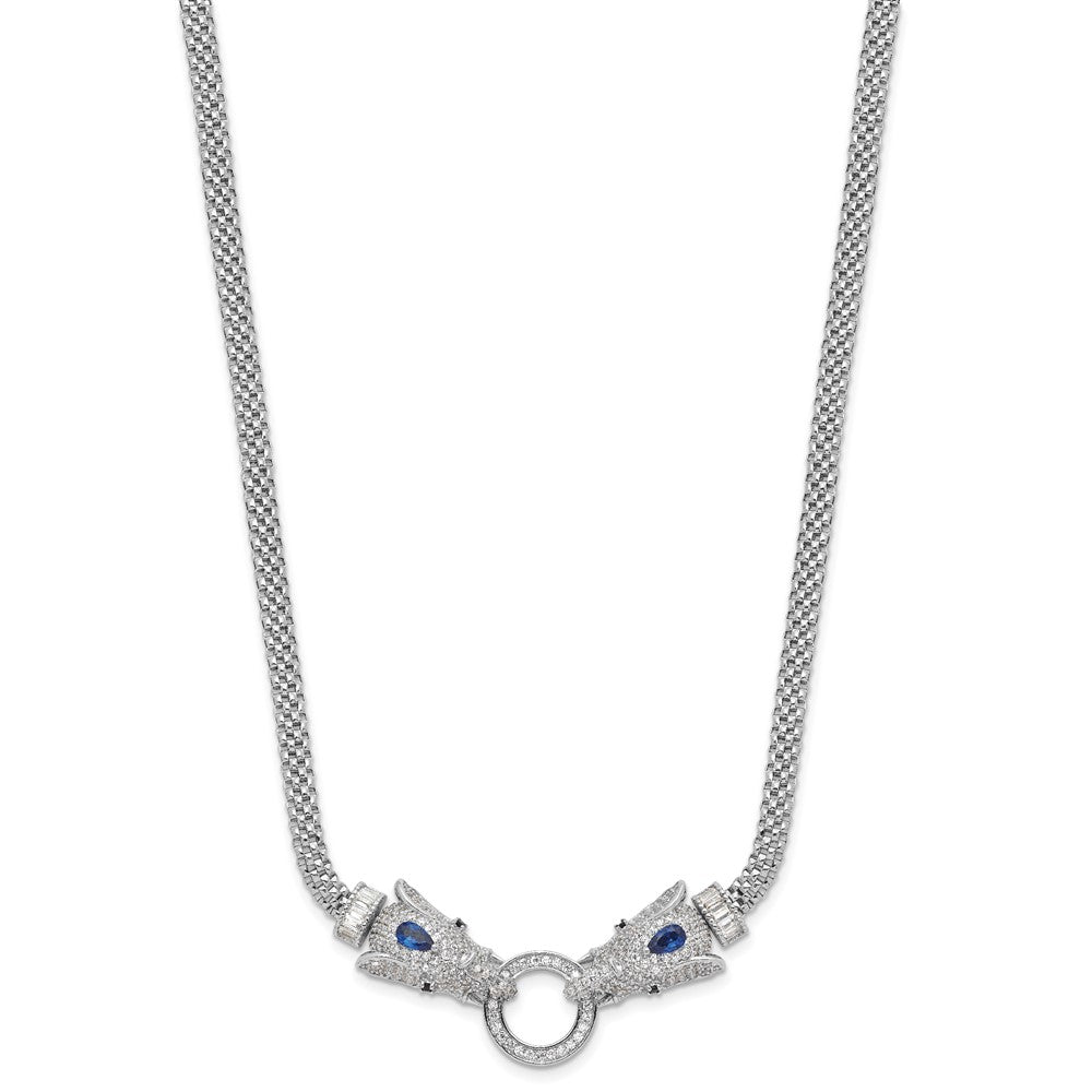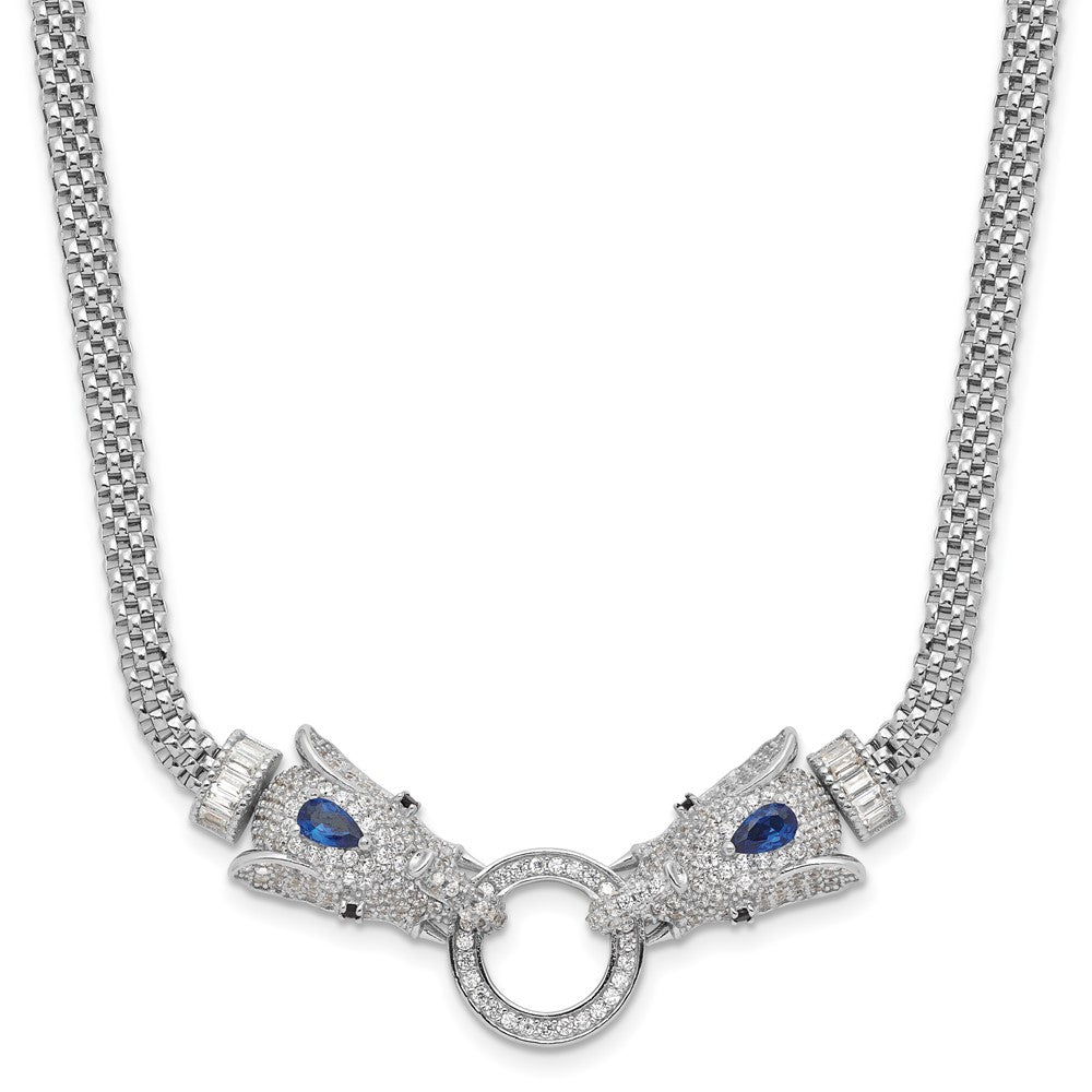 Specifications: Material: Primary - Purity:925|Finish:Polished|Stone Type_1:Cubic Zirconia (CZ)|Stone Type_2:Cubic Zirconia (CZ)|Stone Color_1:White|Stone Color_2:Blue|Stone Quantity_2:6|Length of Item:18 in|Stone Setting_1:Pave|Stone Setting_2:Prong Set|Chain Length:18 in|Chain Type:Mesh|Chain Width:4 mm|Charm/Element Length:20 mm|Charm/Element Width:44 mm|Clasp /Connector:Box Catch|Feature:Hollow|Material: Primary:Sterling Silver|Completeness:Complete (all stones included)|Stone Shape_1:Round|Stone Treatment_1:Synthetic|Stone Treatment_2:Synthetic|Width of Item:44 mm|Product Type:Jewelry|Jewelry Type:Necklaces|Sold By Unit:Each|Necklace Type:Fancy Necklace|Pendant/Charm Type:Themed|Gender:Women's|Material: Primary - Color:White|Number of Elements:1|Plating Color:Silver Tone|Stone Creation Method_1:Synthetic|Stone Creation Method_2:Synthetic|Plating: Chain:Rhodium