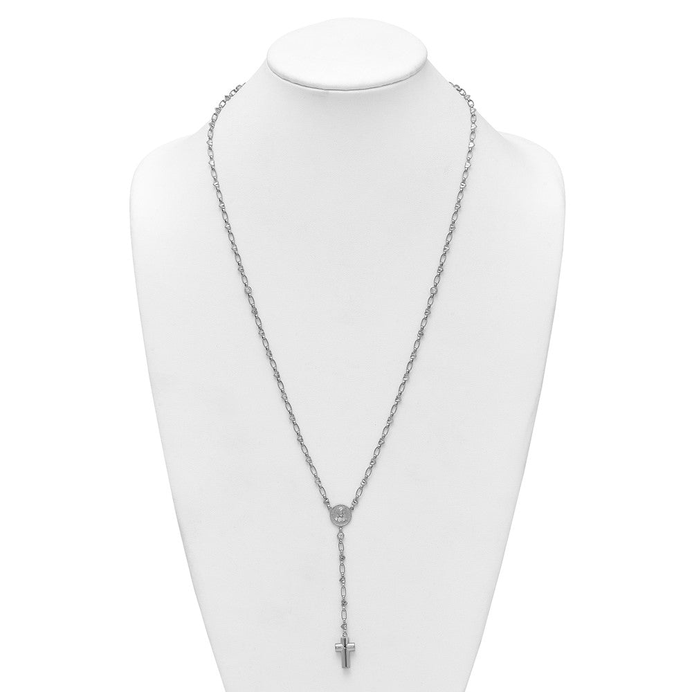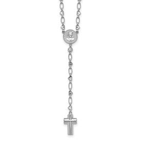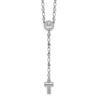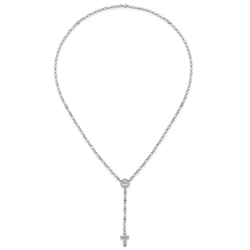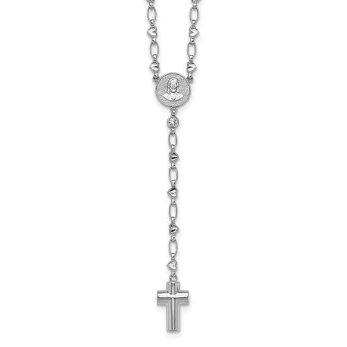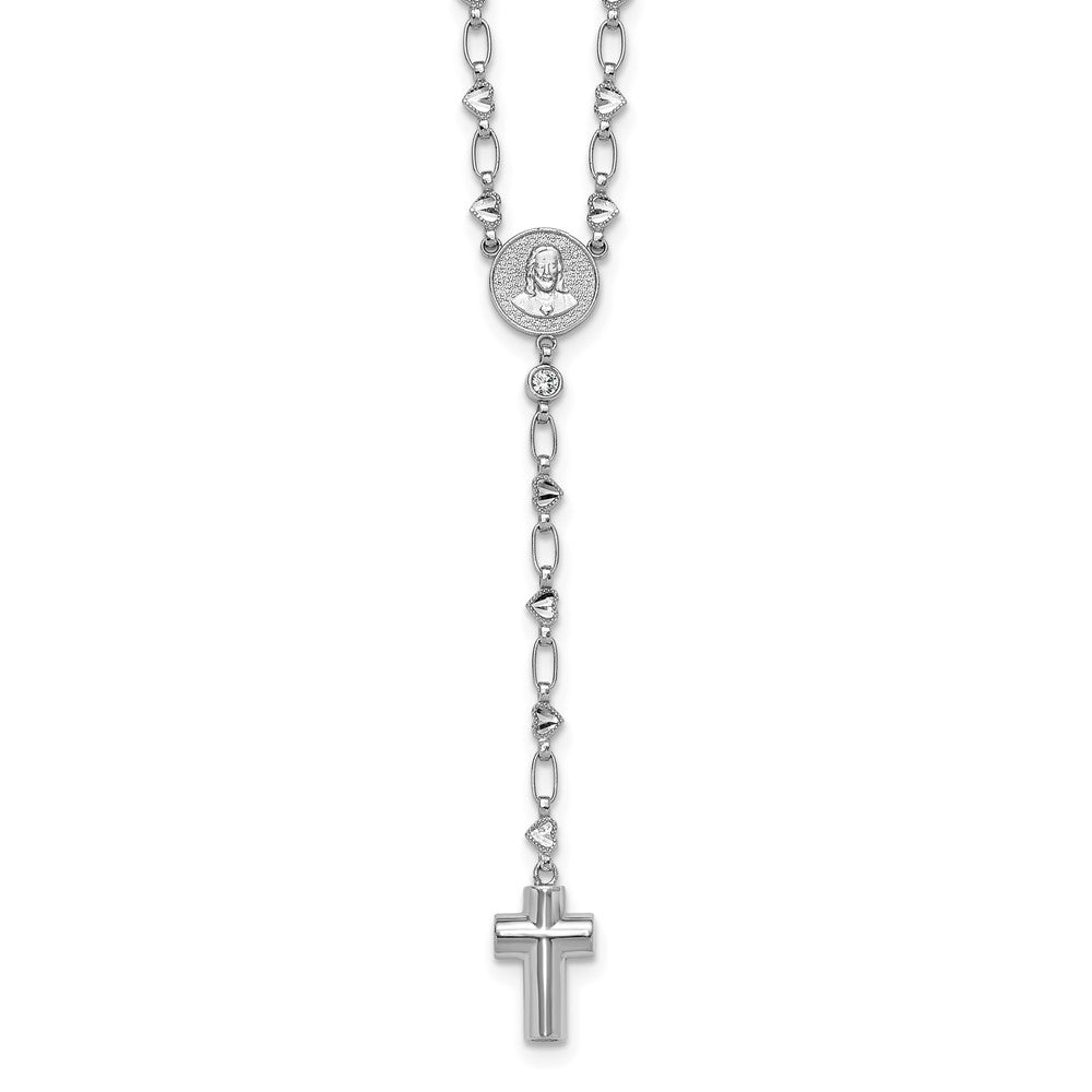 Sterling Silver Rhodium-plated CZ and Diamond-cut Heart Link with Cross Ash Holder 26.5 inch Rosary Necklace